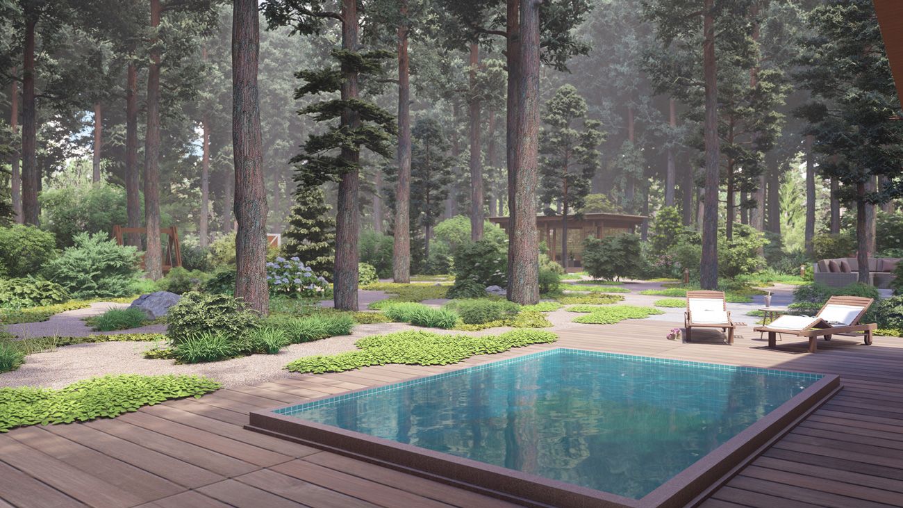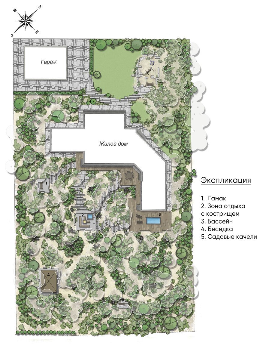 Главная задача архитектора заключалась в максимальном сохранении естественного ландшафта при создании новых функциональных зон: игровой зоны для ребенка, зоны отдыха, уличного бассейна, беседки-кальянной и др. Сад должен быть привлекателен в любое время года, поэтому особое внимание в проекте уделено разработке дендроплана, цветочного оформления и ландшафтного освещения.