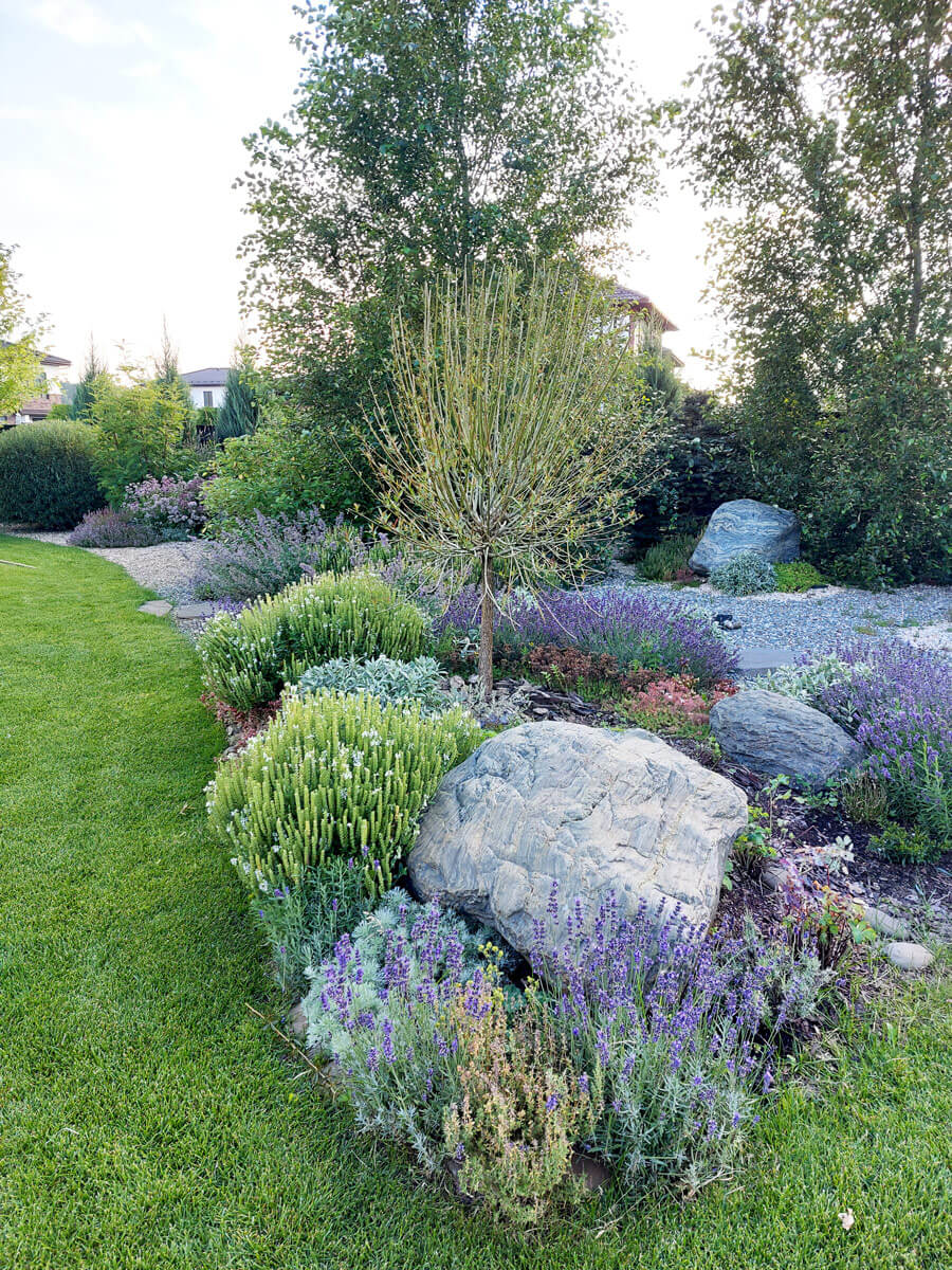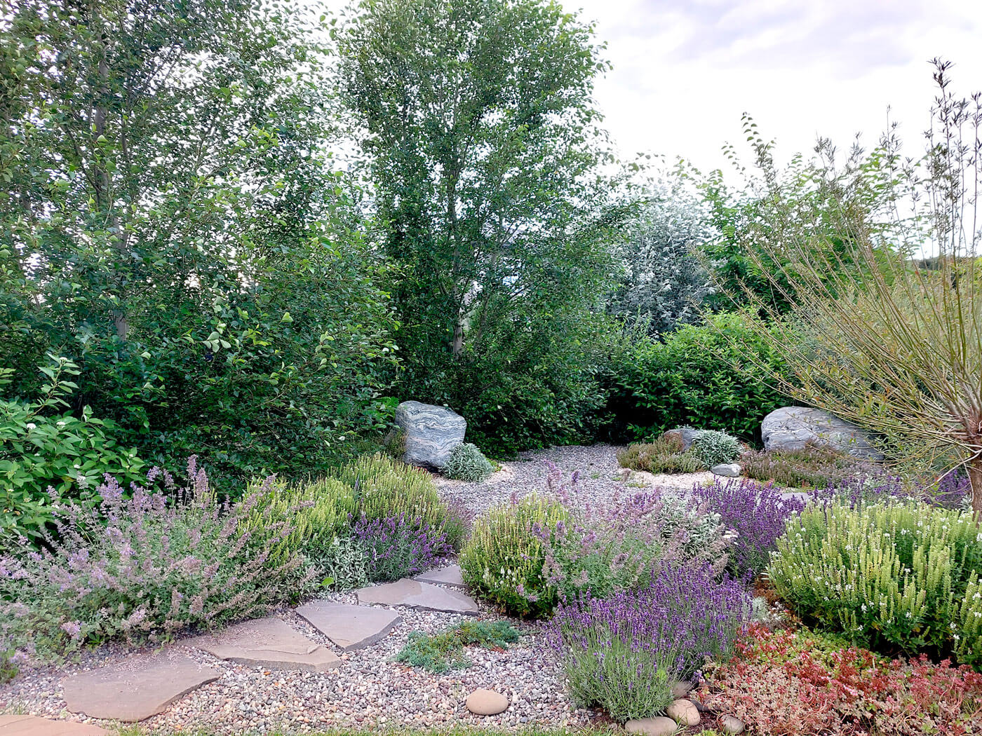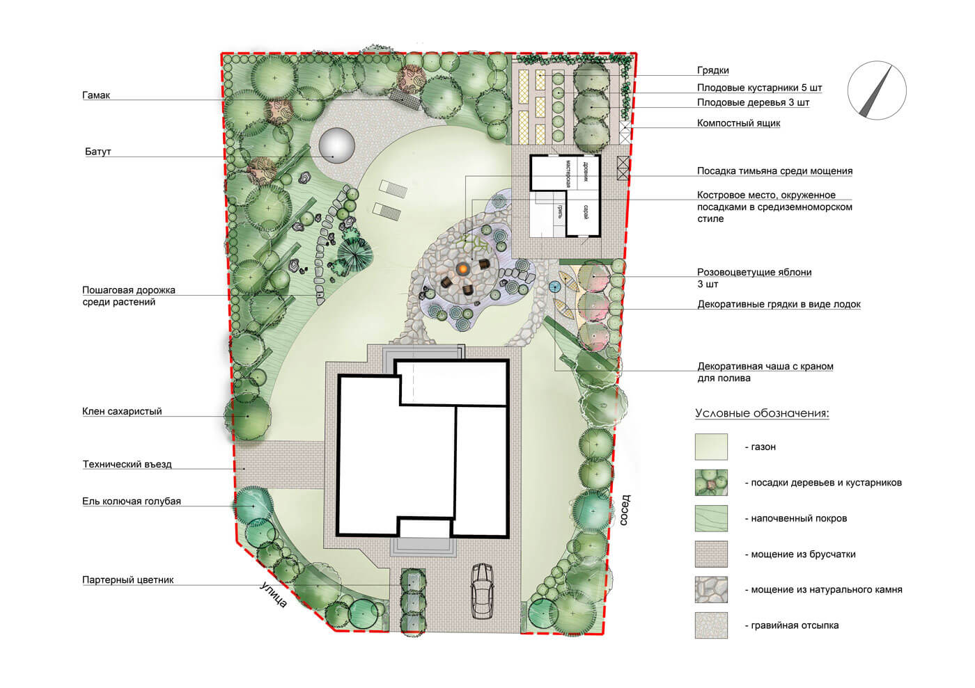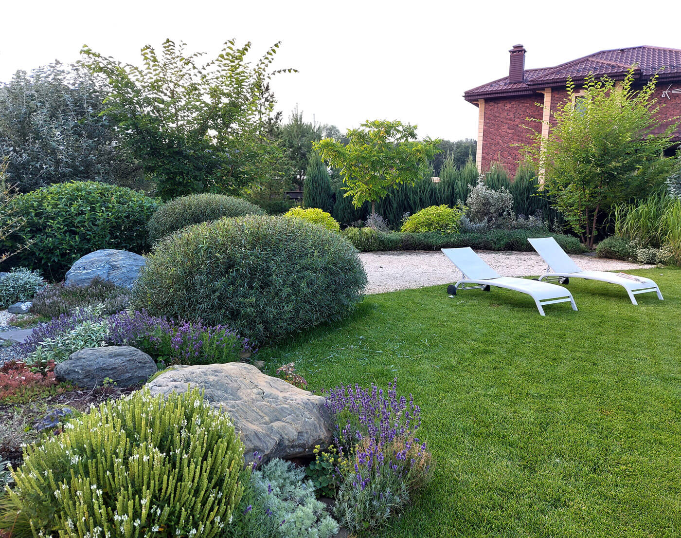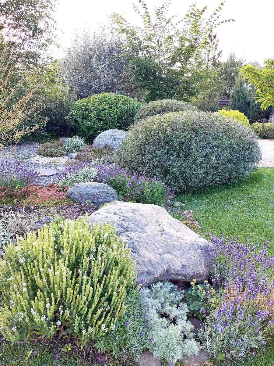 Центром притяжения в саду является костровое место, окруженное серебристыми свечками можжевельников и посадками ароматных цветов (лаванда узколистная, котовник фассера, шалфей дубравный и пр).