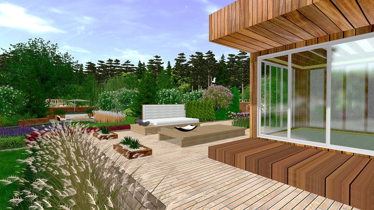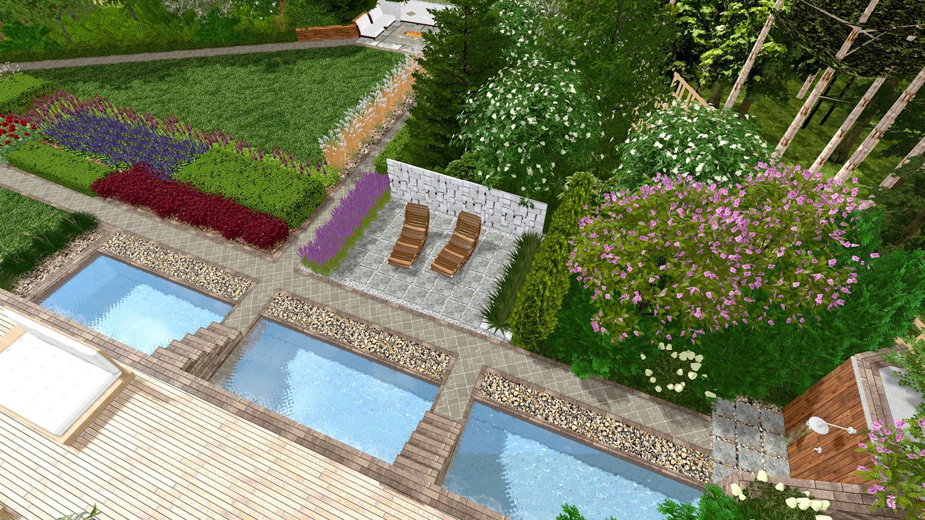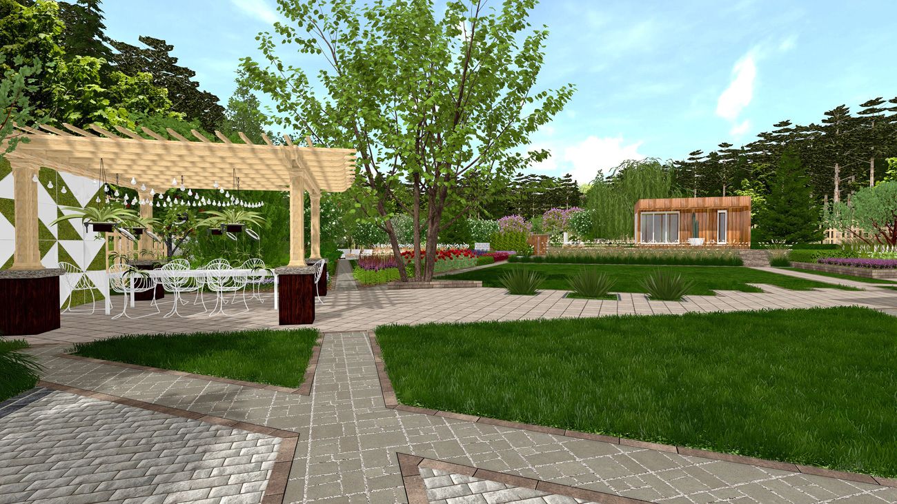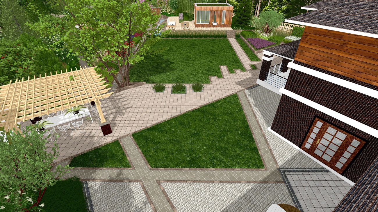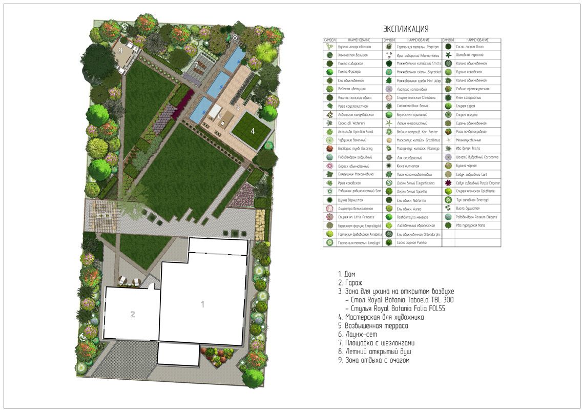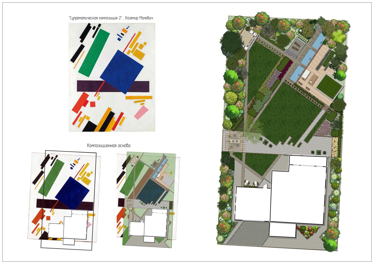 Этот проект сада создан для молодой художницы и ее семьи. В исходных данных имелся пустой участок с перепадами по высоте по правой стороне будущего сада. Было придумано несколько планировок, но окончательную концепцию решил странный случай — сон с картиной Каземира Малевича «Супрематическая композиция». Выяснилось, что будущая хозяйка сада является горячей поклонницей авангардизма, и Малевича в частности.