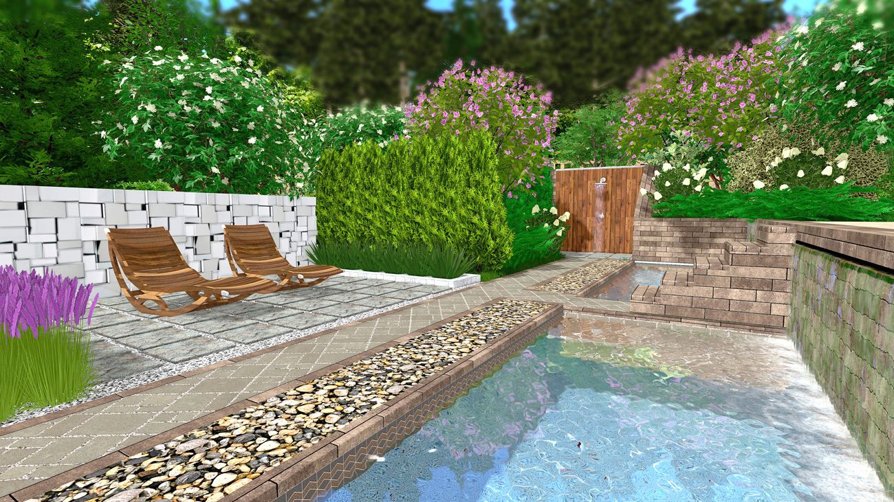 На верхней террасе расположилась мастерская для художницы. Здесь же небольшая лаунж-зона с покрытием из террасной доски из лиственницы. Спускаясь с террасы, попадаем в следующую зону — для релаксации. Отдыхая на площадке с шезлонгами для солнечных процедур, приятно наблюдать за стекающей с подпорной стенки водой. В жаркий день можно охладиться под открытым летним душем в окружении зелени.