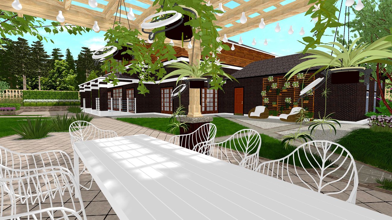 Ближе к дому расположилась зона для уютных ужинов на открытом воздухе. Деревянная пергола украшена светильниками и ампельными растениями в горшках с автополивом. В качестве декоративной ширмы установлена стена из бетона с зелеными элементами из стабилизированного мха. Эту зону хотелось выполнить в экоботаническом стиле. Стол и садовые стулья в виде листиков для этой зоны выбраны из категории премиальной садовой мебели Royal Botania <a href=