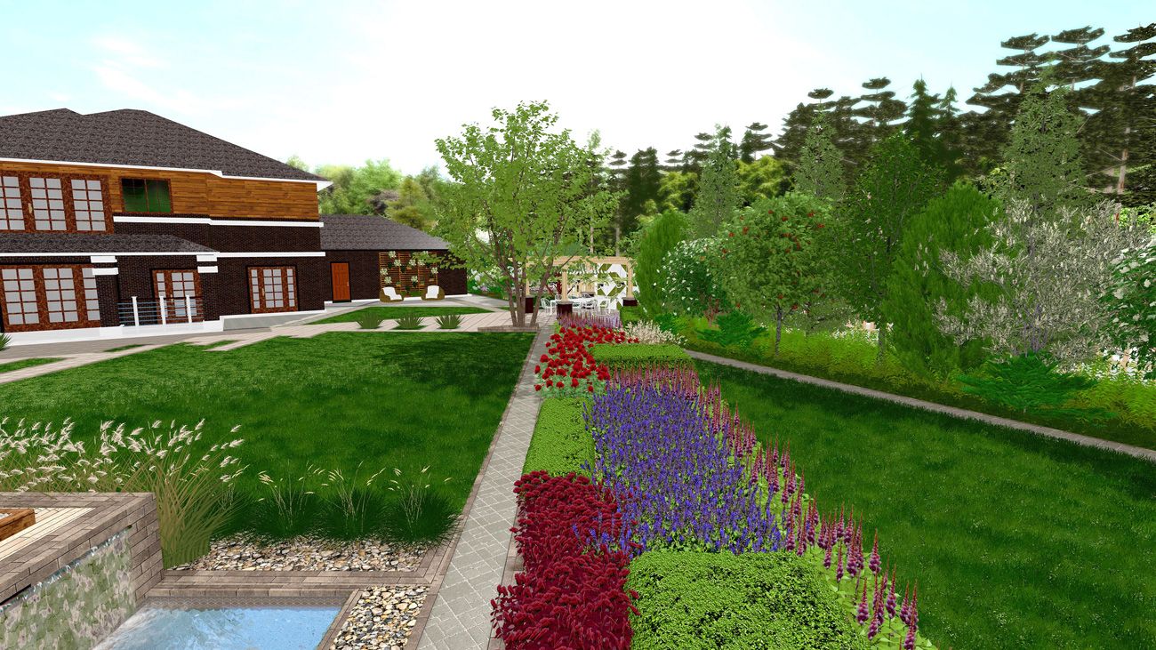 Так, в композиционную основу легла картина. Прием не новый, но чудесным образом прекрасно подошедший именно здесь. Дорожки, конфигурация миксбордеров, террасы — все сформировано по основным композиционным линиям картины.