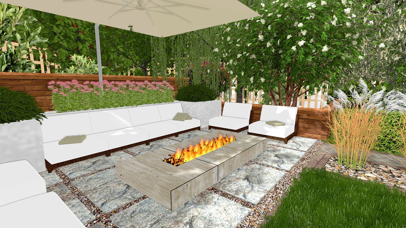 В самом дальнем углу расположена зона для посиделок у открытого огня. С трех сторон она укрыта зеленью. Но сидя на диване, можно созерцать перспективу почти всего сада.