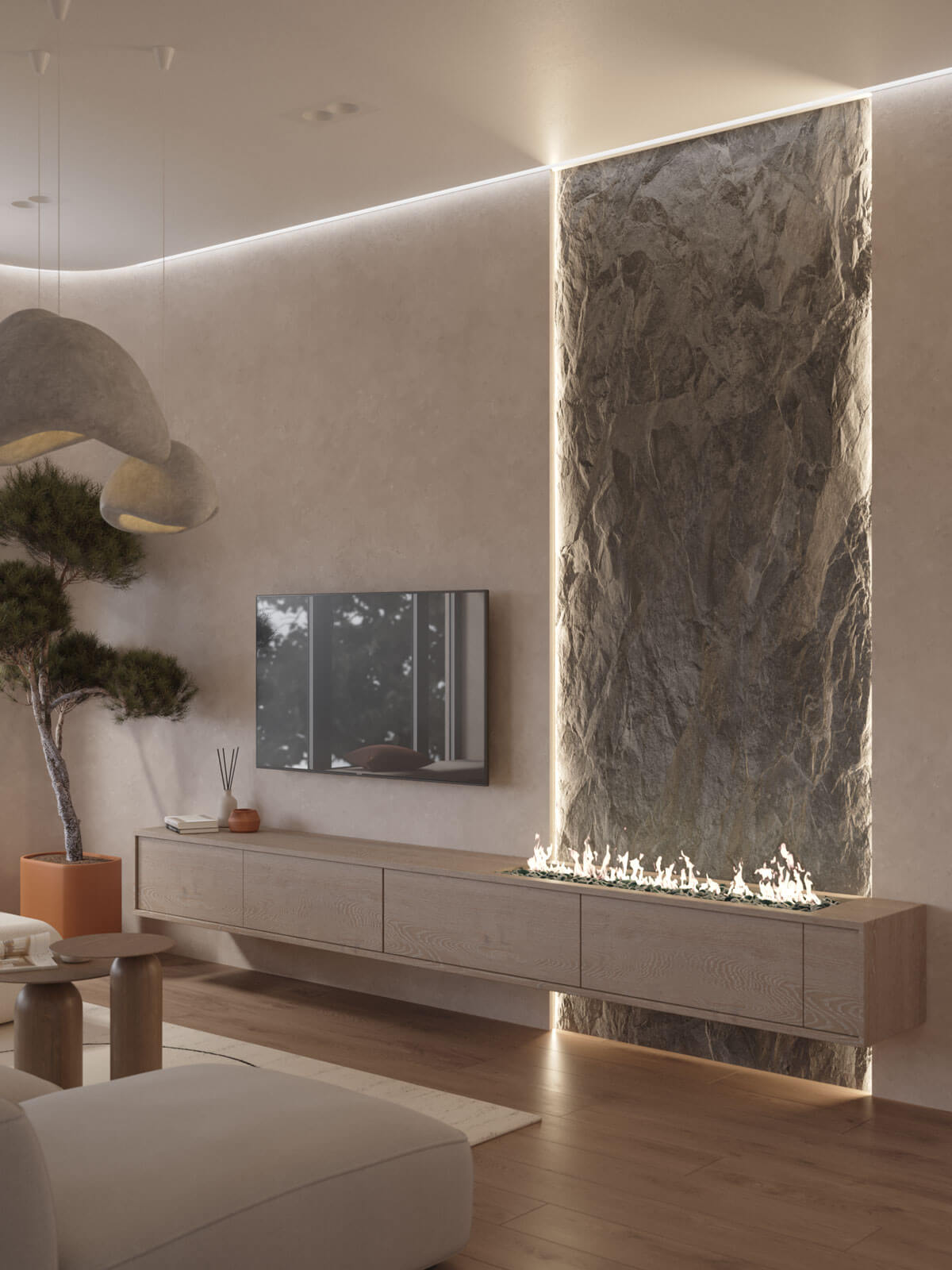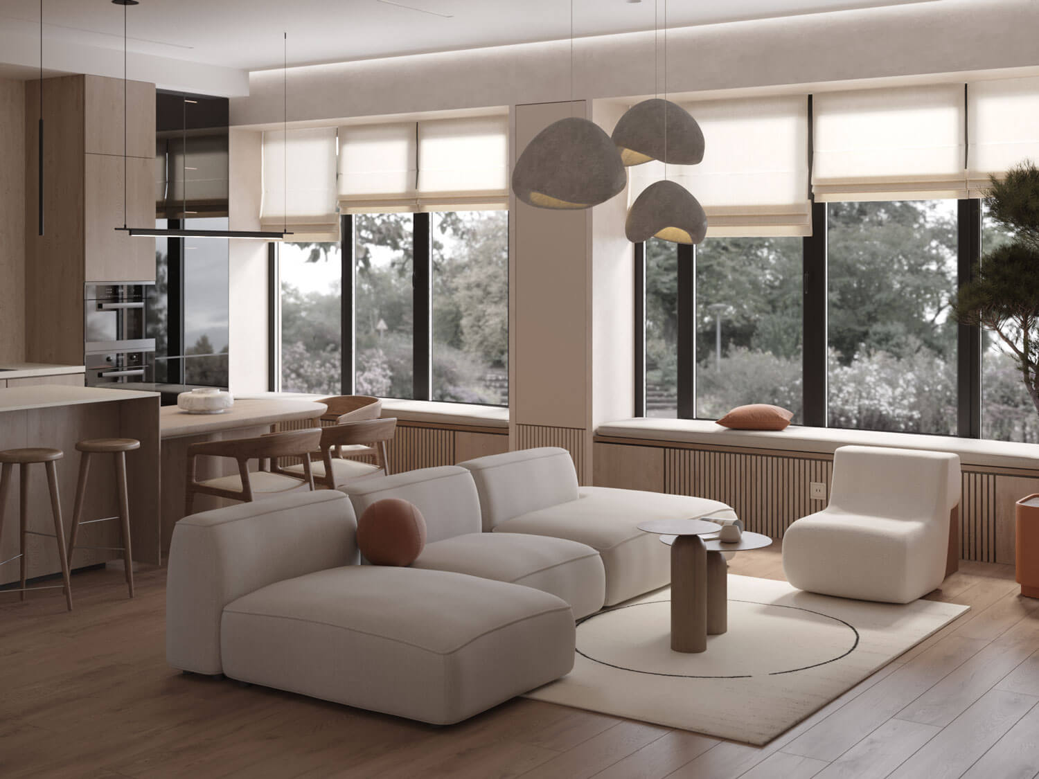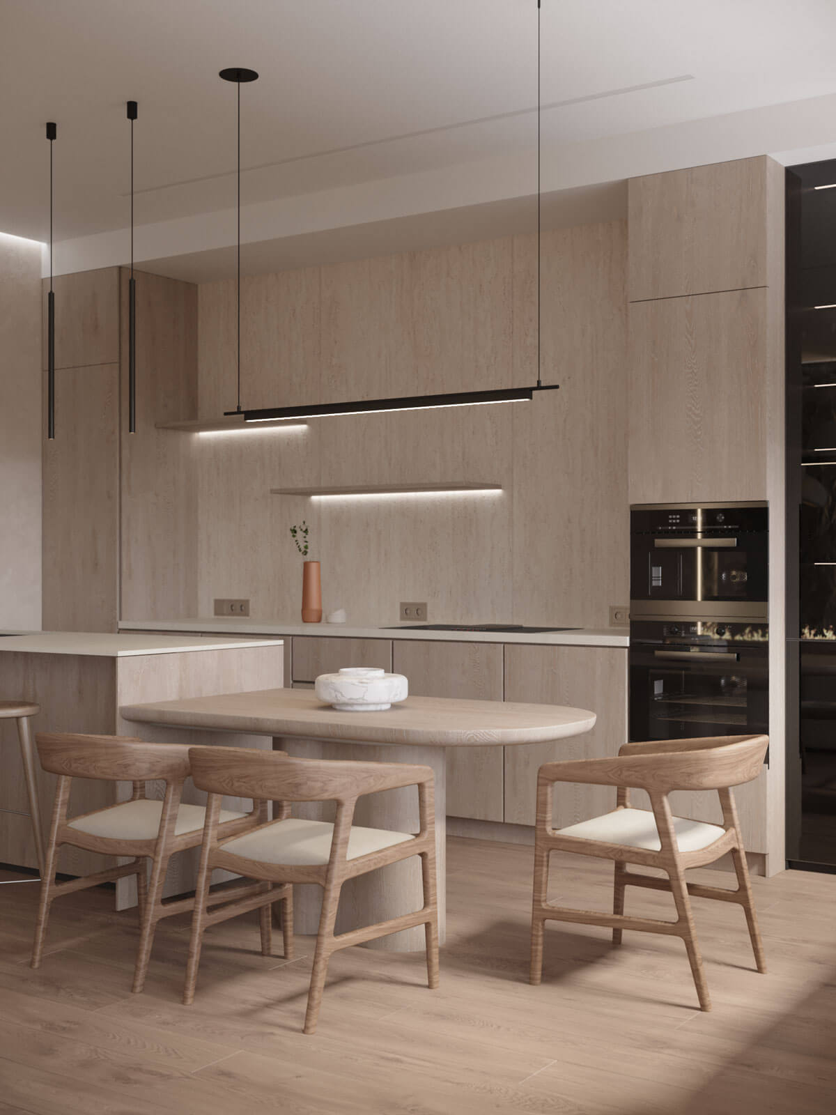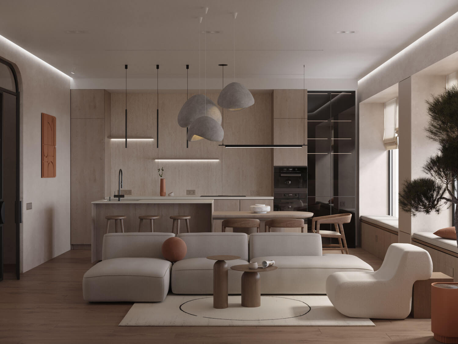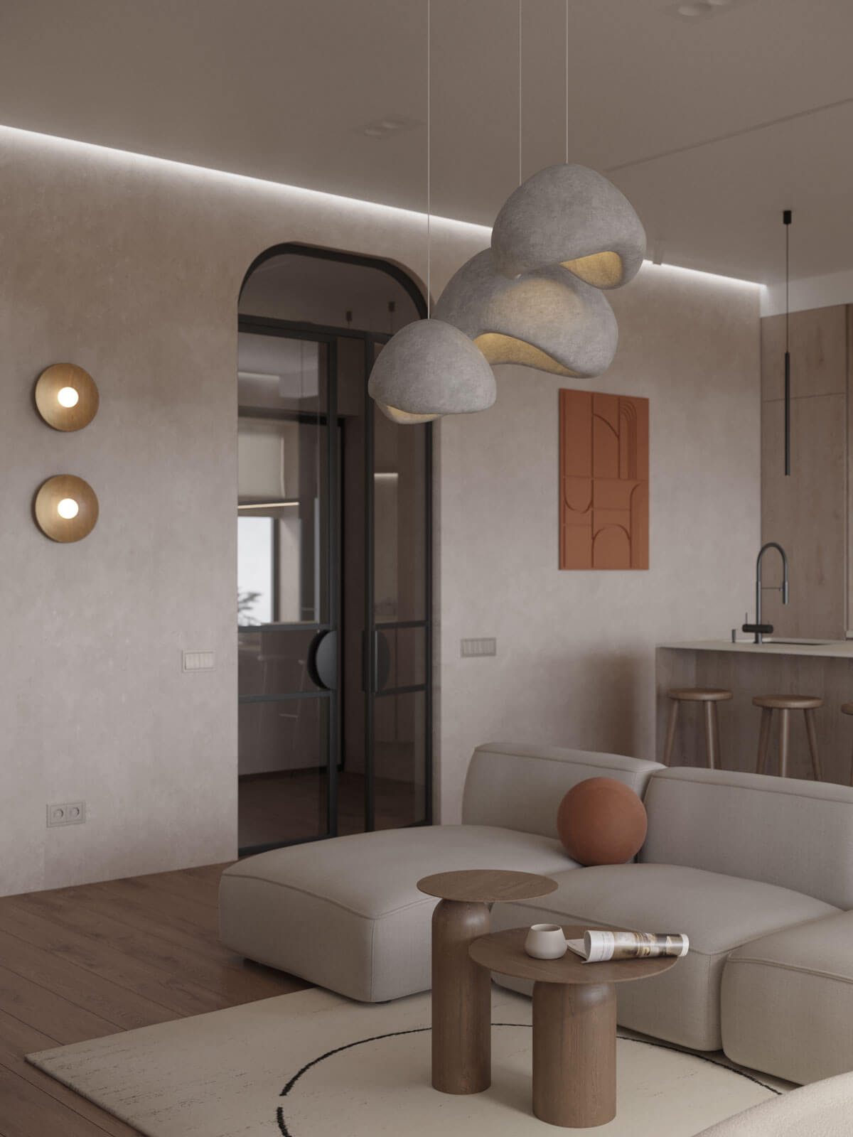 Интерьер квартиры, выполнен в стиле джапанди, стал истинным произведением искусства, гармонично сочетая японскую эстетику с северной функциональностью.