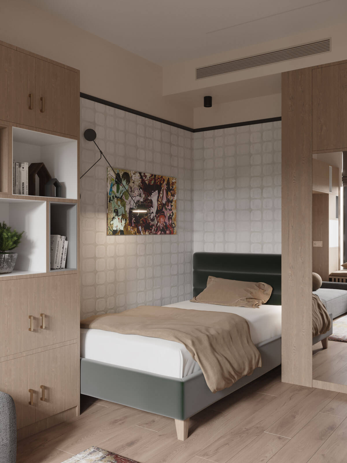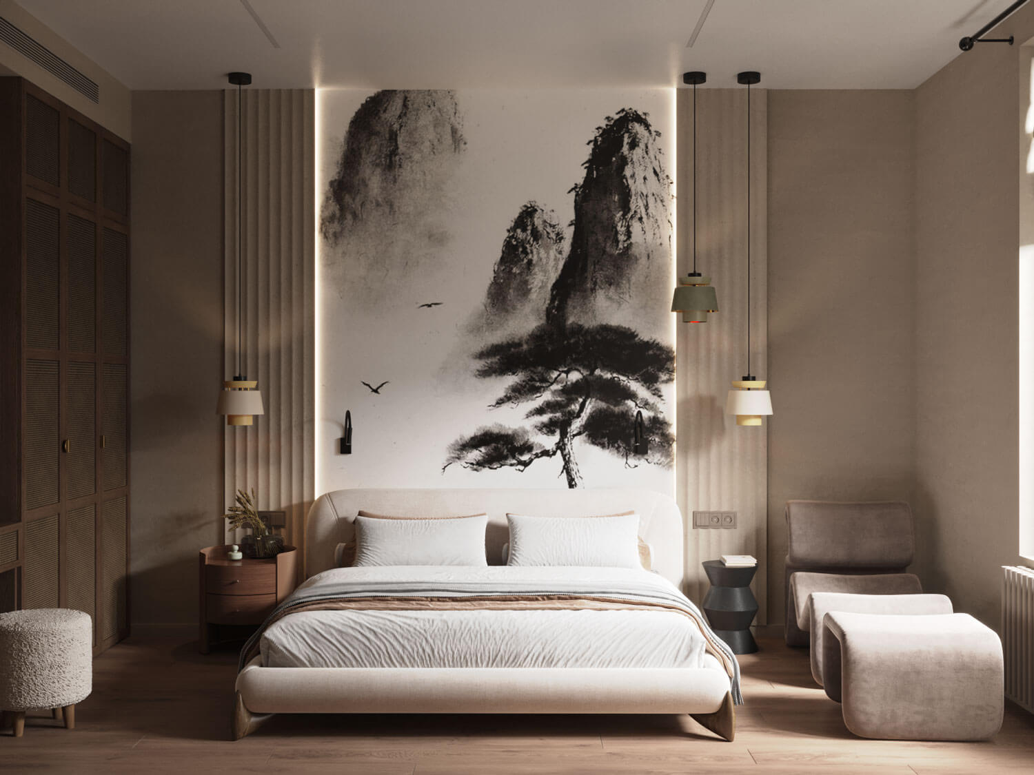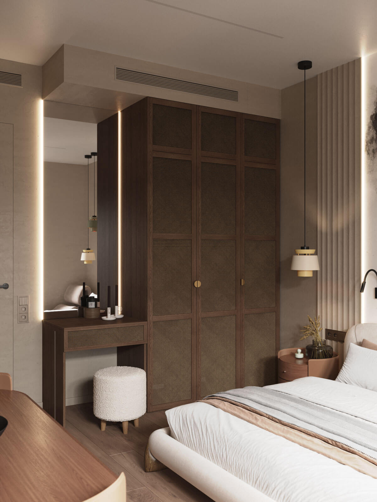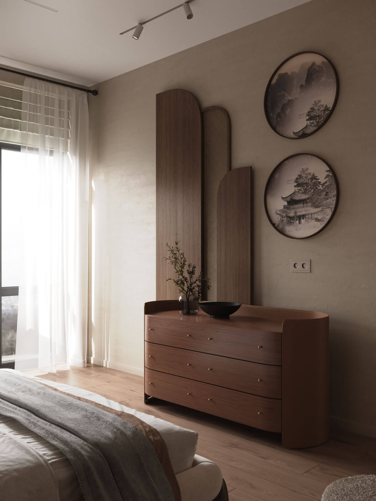 В основе проекта лежит использование природных материалов и текстур. Декоративная штукатурка под травертин на стенах формирует уникальную атмосферу, а фреска с традиционным японским домиком, расположенная за изголовьем кровати, добавляет нотку умиротворения и погружает в японскую культуру. Я особое внимание уделил выбору шпона и ротанга для корпусной мебели, что подчеркивает мою приверженность к экологичности и натуральности.