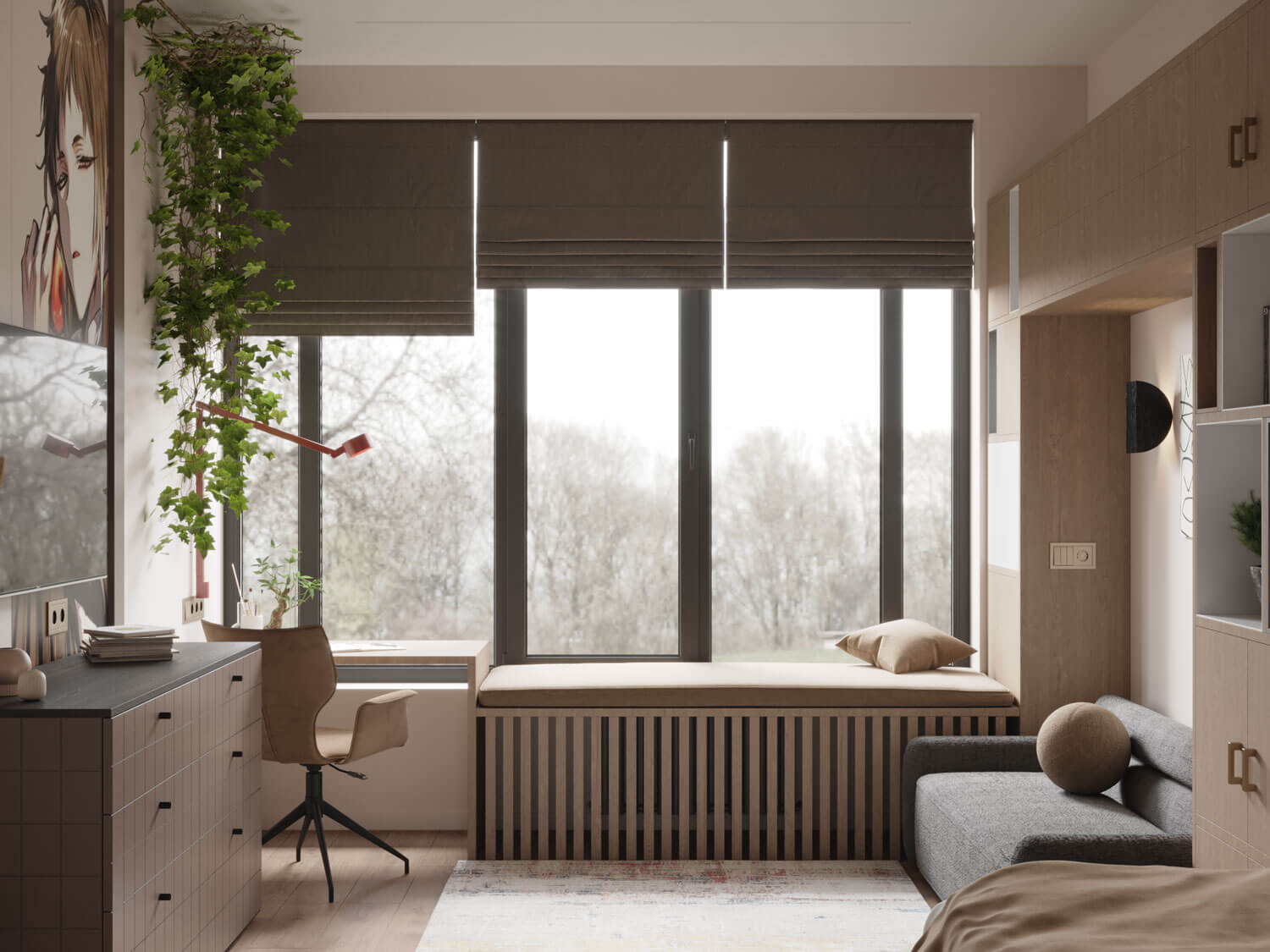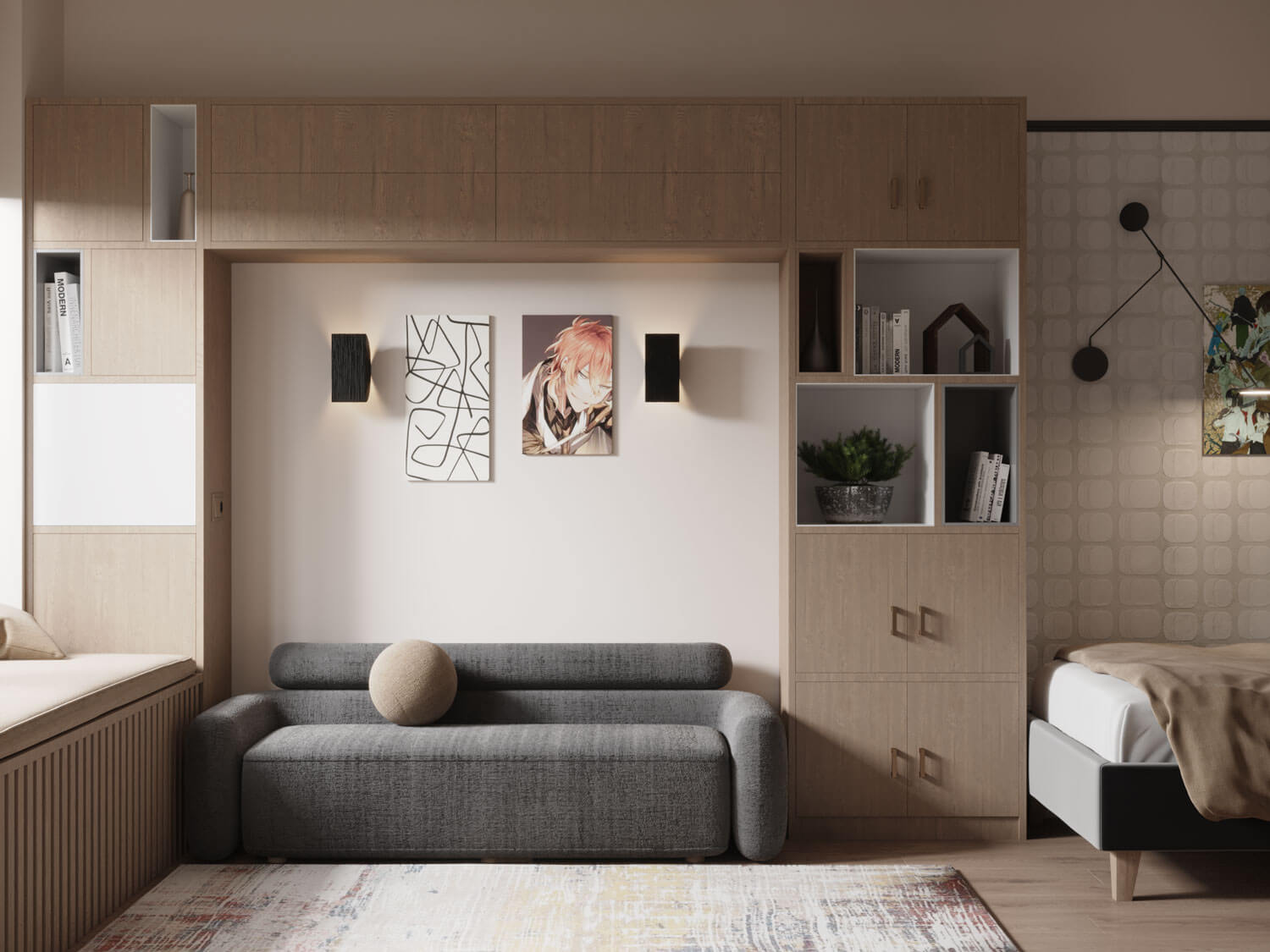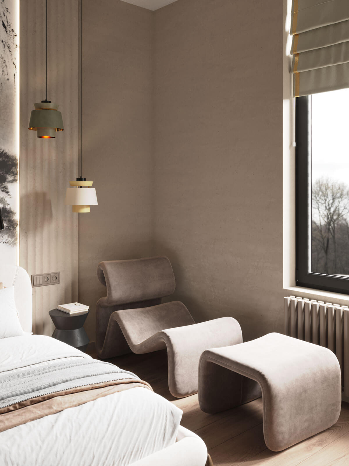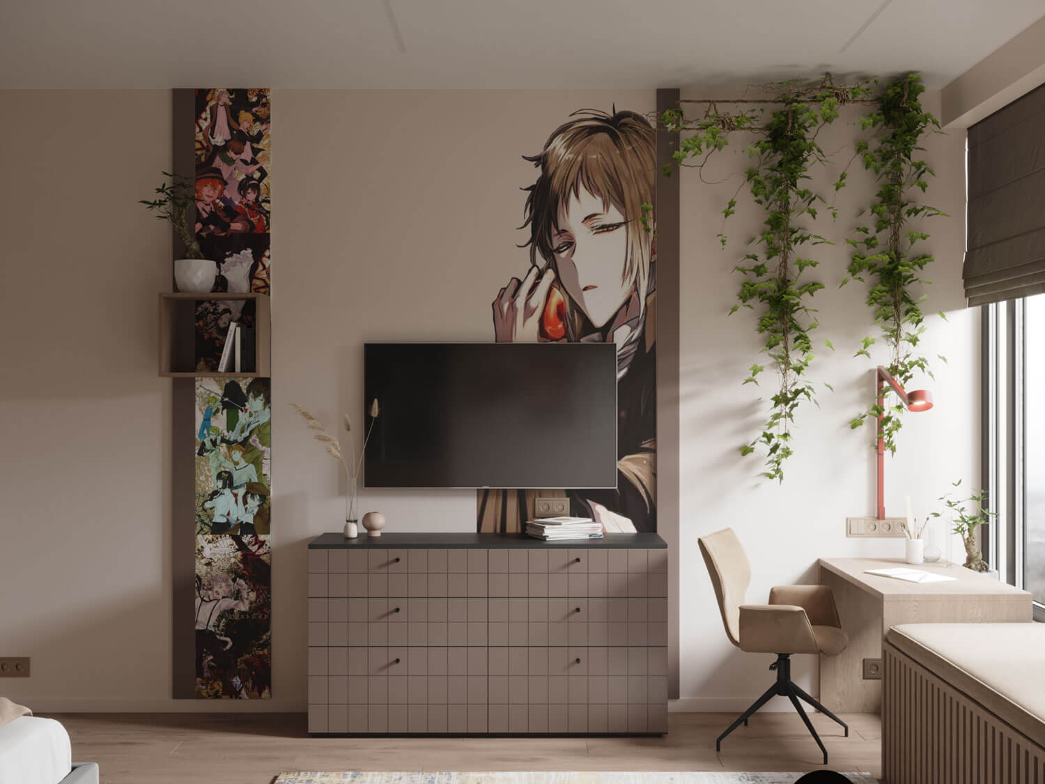 В основе проекта лежит использование природных материалов и текстур. Декоративная штукатурка под травертин на стенах формирует уникальную атмосферу, а фреска с традиционным японским домиком, расположенная за изголовьем кровати, добавляет нотку умиротворения и погружает в японскую культуру. Я особое внимание уделил выбору шпона и ротанга для корпусной мебели, что подчеркивает мою приверженность к экологичности и натуральности.