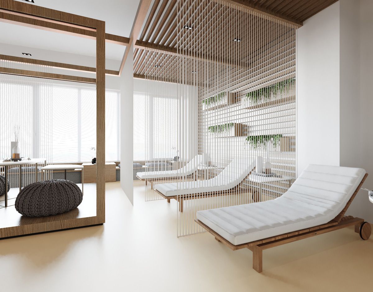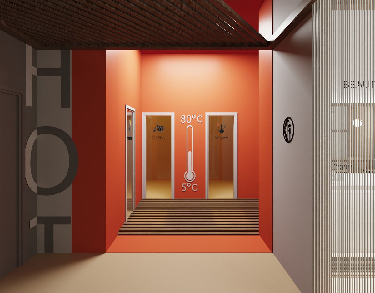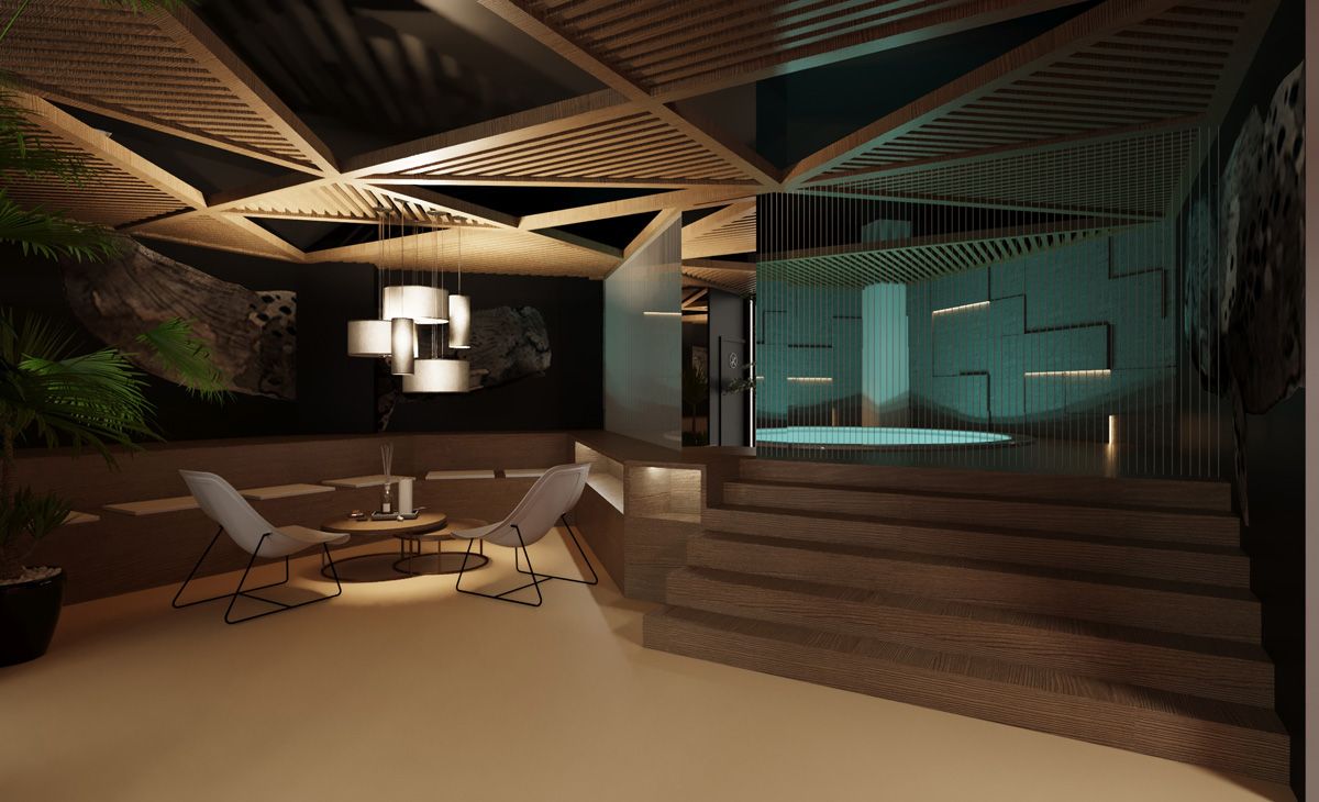 Основная задача проекта — обеспечить комфорт и удобство пребывания посетителей. Теплое цветовое решение, натуральные материалы (дерево, камень). Места для отдыха, специально-оборудованные зоны для спа-процедур.