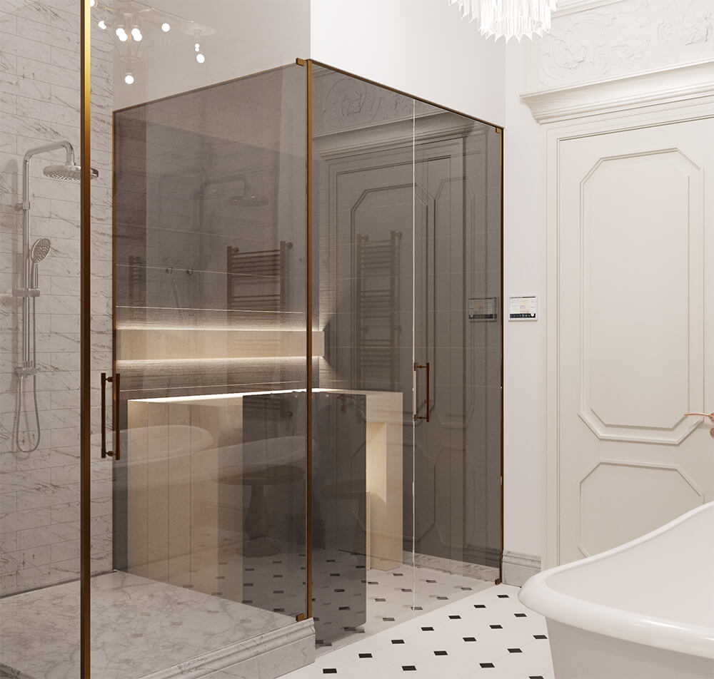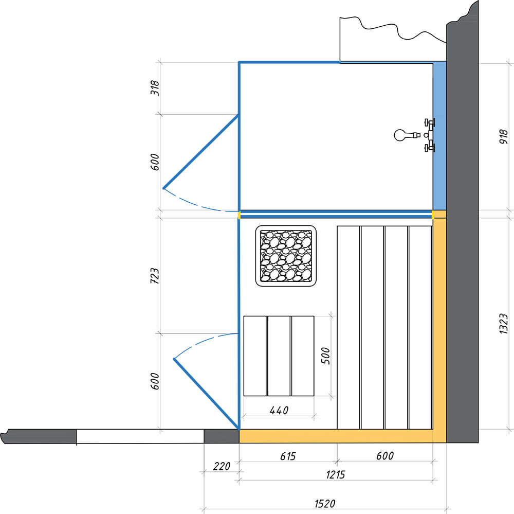 Плюс ко всему стенка, прилегающая к душевой, представляет собой специализированный стеклопакет, который позволяет комфортно принимать душ при разогретой сауне.