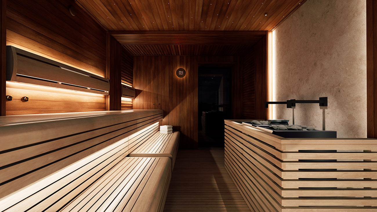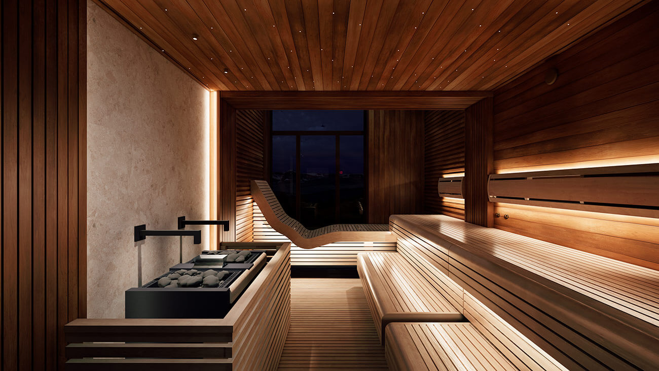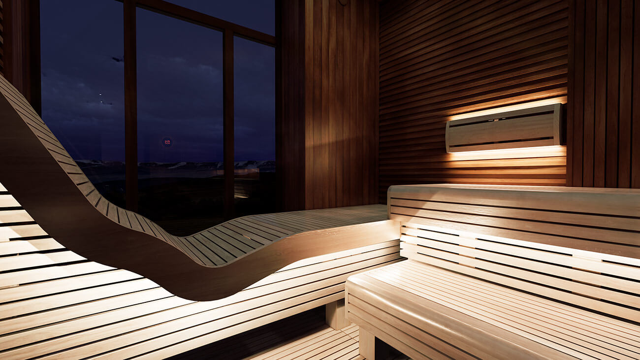 Светлая древесина ольхи в комбинации с темной термически обработанной ольхой является основным материалом отделки в проекте «Утро в Манхэттене». Ольха – надежный, качественный и долговечный материал, который со временем не теряет внешний вид в агрессивных условиях парного помещения. Мраморный слэб и нежная розоватая подсветка создают атмосферу уюта, продолжая внешнюю лаундж-зону в сауне.