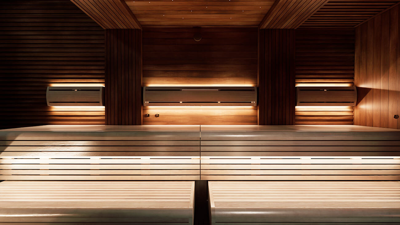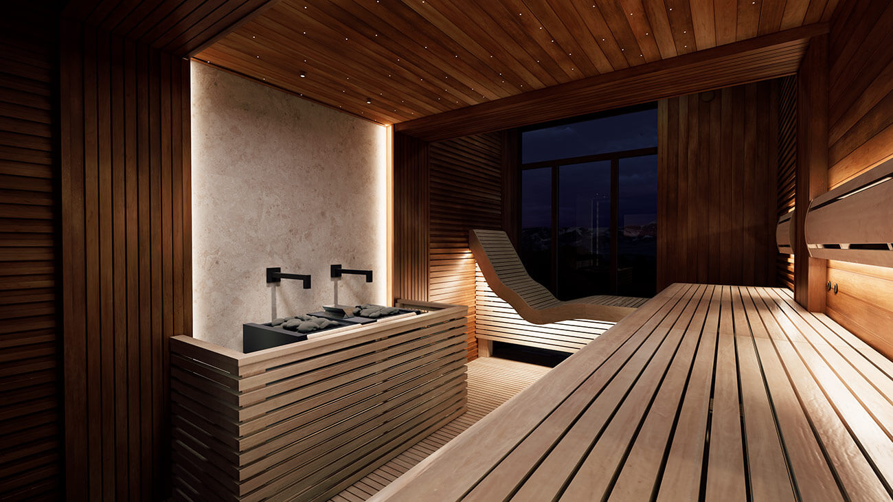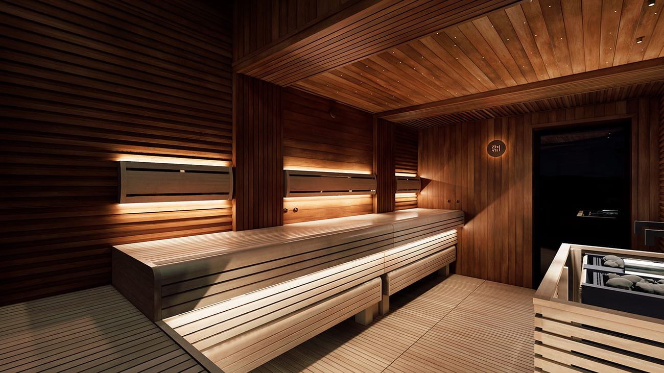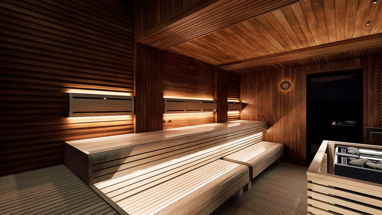 Светлая древесина ольхи в комбинации с темной термически обработанной ольхой является основным материалом отделки в проекте «Утро в Манхэттене». Ольха – надежный, качественный и долговечный материал, который со временем не теряет внешний вид в агрессивных условиях парного помещения. Мраморный слэб и нежная розоватая подсветка создают атмосферу уюта, продолжая внешнюю лаундж-зону в сауне.