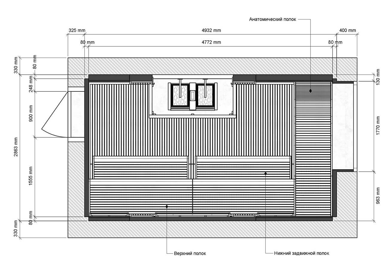 По длинной стороне парной мы разместили двухуровневые закругленные полки с зашивкой. Анатомический полок повторяет естественные изгибы тела человека, помогает принять наиболее удобное положение сидя. Это способствует большему расслаблению при парении.