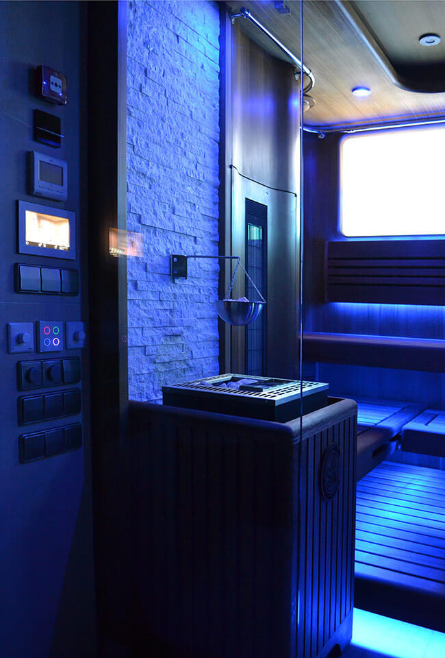 • Оборудование для сауны (печь с испарителем, пульт управления с цветным интерактивным дисплеем , инфракрасный излучатель) — все EOS (Германия).