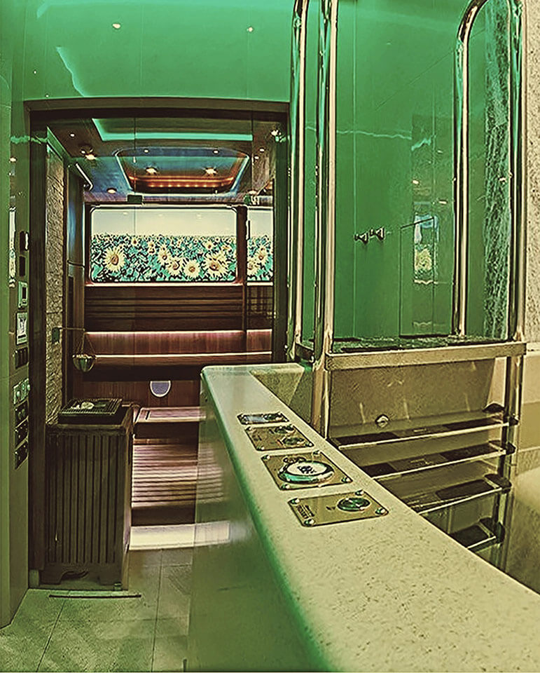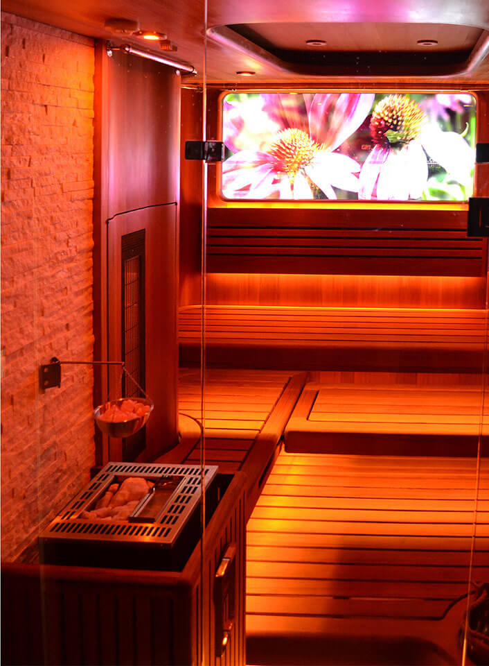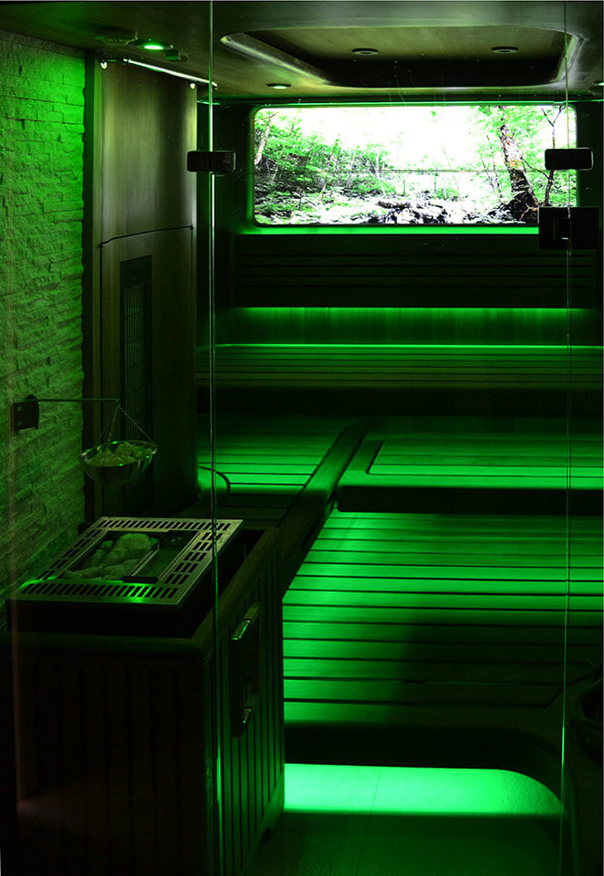 “Сауна впечатлений” - сауна оснащена мультимедийной системой управления (свет, аудио и видео), создающей атмосферные и эмоциональные специальные эффекты c целью оздоравливающего воздействия на клиентов.