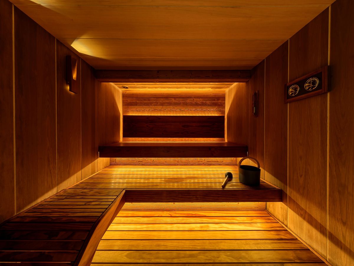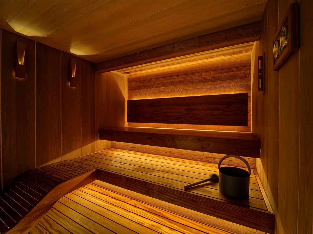 Для создания мягкого, рассеянного света, характерного для средиземноморского, обласканного солнцем побережья, в проекте использовали непрямое освещение с богатой палитрой естественных теплых оттенков. В сауне несколько групп освещения: от встроенных в каждый уровень пологов до массивной потолочной балки из состаренной фактурной древесины. Внутри балки размещается скрытая подсветка, задача которой — дать теплое освещение над центральным парильным пологом и подчеркнуть красоту шероховатой фактуры древесины, используемой на потолочном пространстве и переходящей на стену за подспинник.