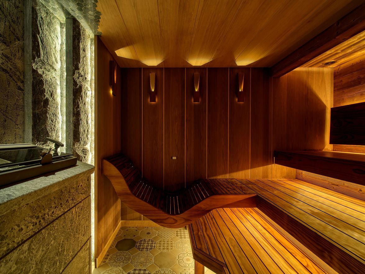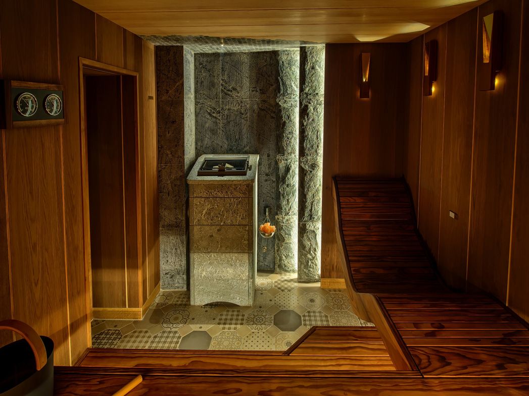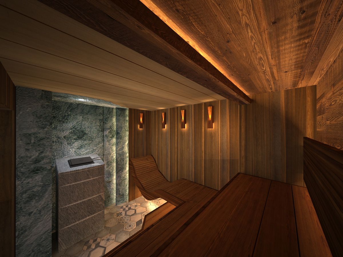 Австрийских панели из темного дуба становятся гармоничным продолжением стены из натурального камня. Потолок отделан европейским дубом. Для пологов выбрана терморадиата с великолепно выступающей текстурой древесины, делающей данный материал непревзойденным с эстетической точки зрения. В отделке пола — керамическая плитка с традиционными итальянскими мотивами. Предварительно установлена система «теплый пол» (для более быстрой просушки полов и отказа от использования деревянных настилов).
