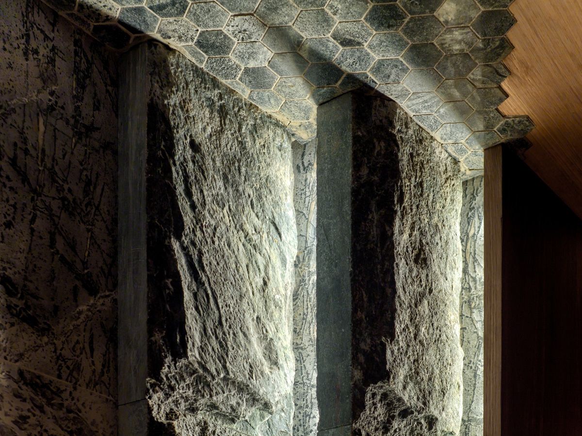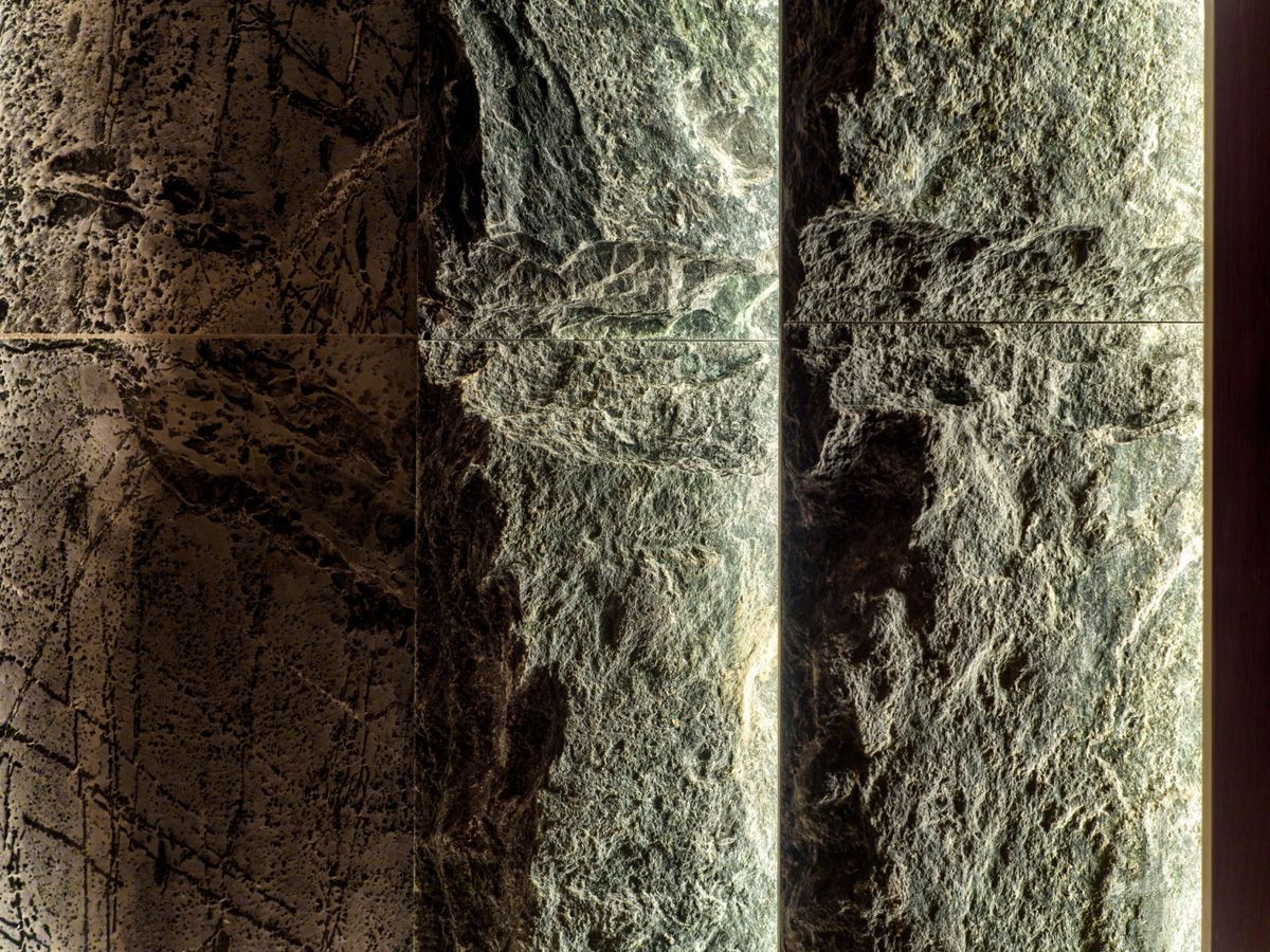 Побережье Средиземного моря покрыто обрывистыми скалами, это было взято за эстетическую основу оформления сауны. Каменная композиция представляет собой возвышающиеся отвесные скалы, расположенные одна за другой, будто парящие вдоль побережья. Строгие, четкие линии без излишеств выглядят особенно благородно, а скрытое освещение подчеркивает непередаваемое многообразие контрастных граней на объемном рельефе. Камень талькомагнезит за печью с античной обработкой поверхности продолжает скалистую тематику. Талькомагнезит быстро нагревается и долго удерживает тепло.