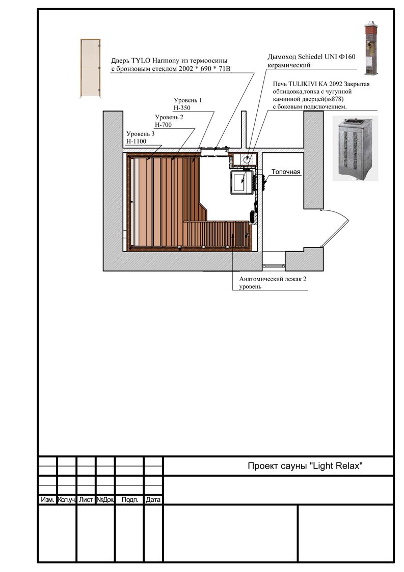В планировке широкие пологи кажутся легкими за счет правильного освещения и полуоткрытой конфигурации, дающей ощущение воздушного пространства под ними. Центральное место сауны занимает полог шириной 800 мм, рассчитанный на комфортное проведении парильных процедур. Подспинник, меняющий свою геометрию за счет угла наклона, позволяет в полулежачем положении наслаждаться отдыхом. Анатомический лежак переходит в сидячий полог второго уровня.