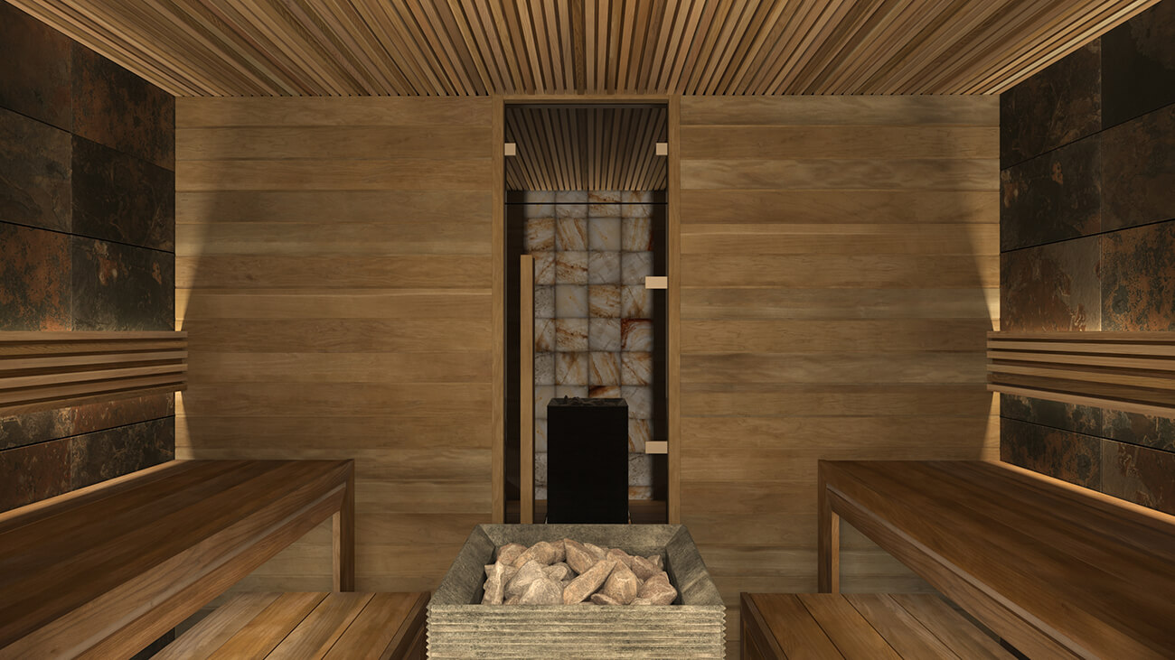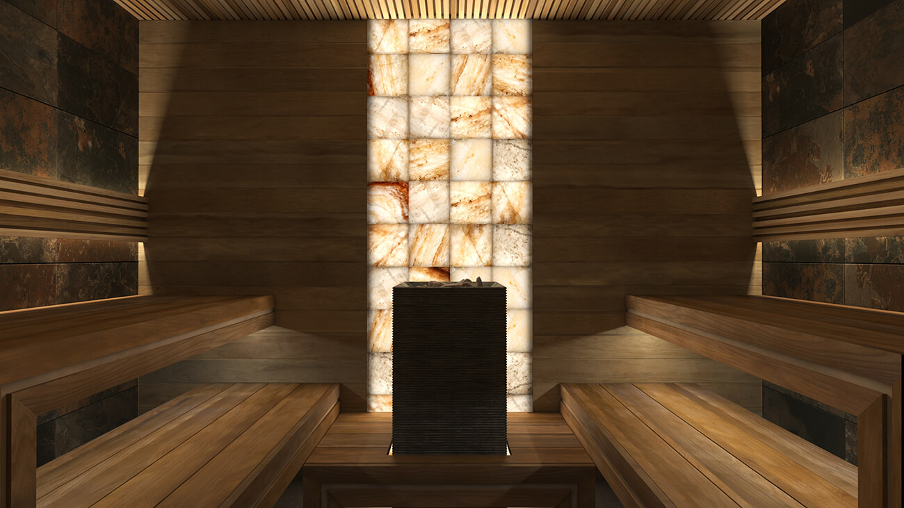 Высокая дверь под потолок спроектирована с глухим стеклом в верхней части. Панно из гималайской соли с подсветкой за печкой. Строгий, острый и симметричный дизайн.