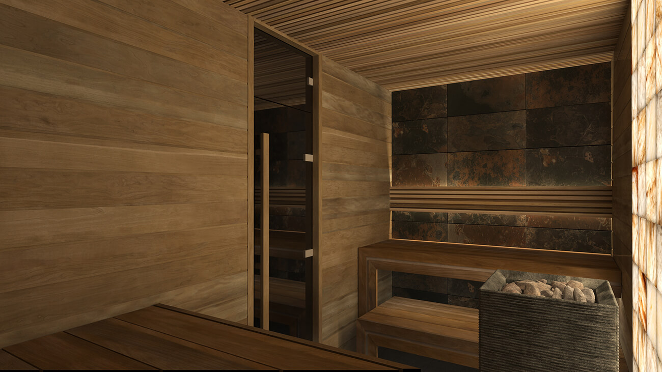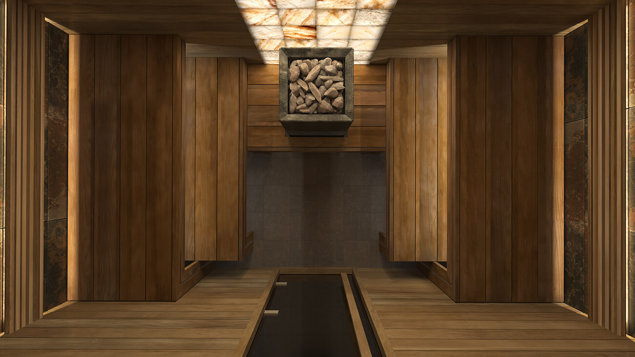Потолок обшит уникальной реечной вагонкой. Рейки вагонки из канадского кедра на основе из термоабаша. В отделке стен скомбинированы термоосина и сланец натуральный. Полог из широкой доски из термоабаша.