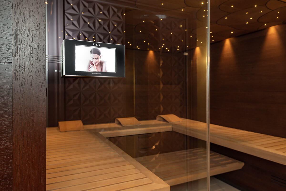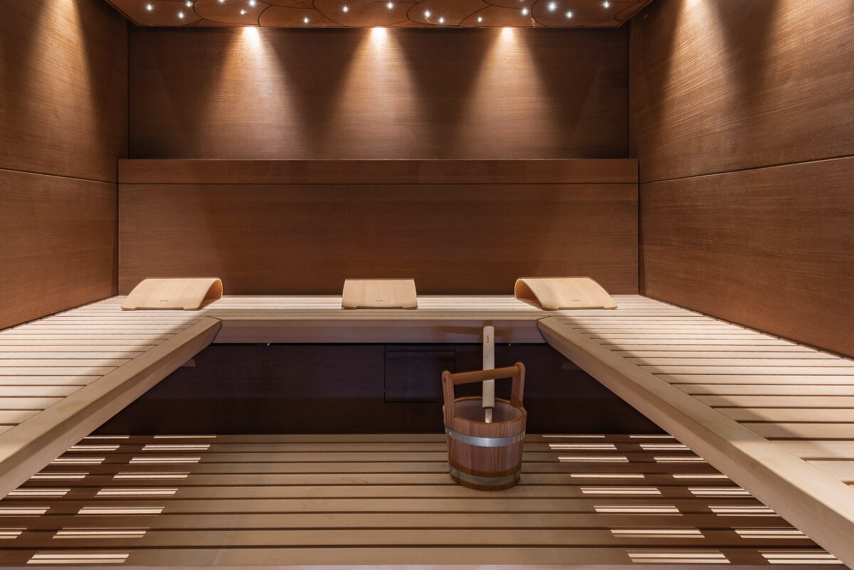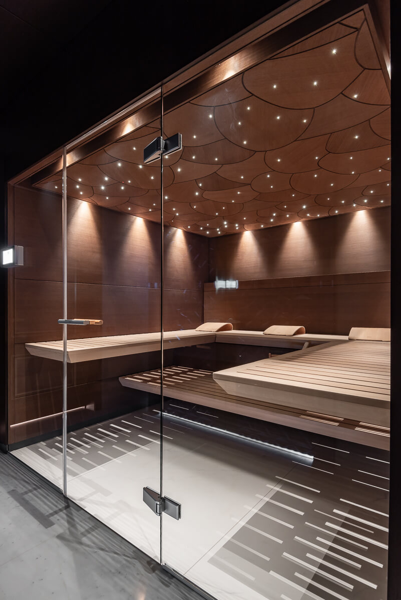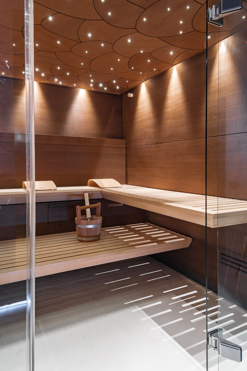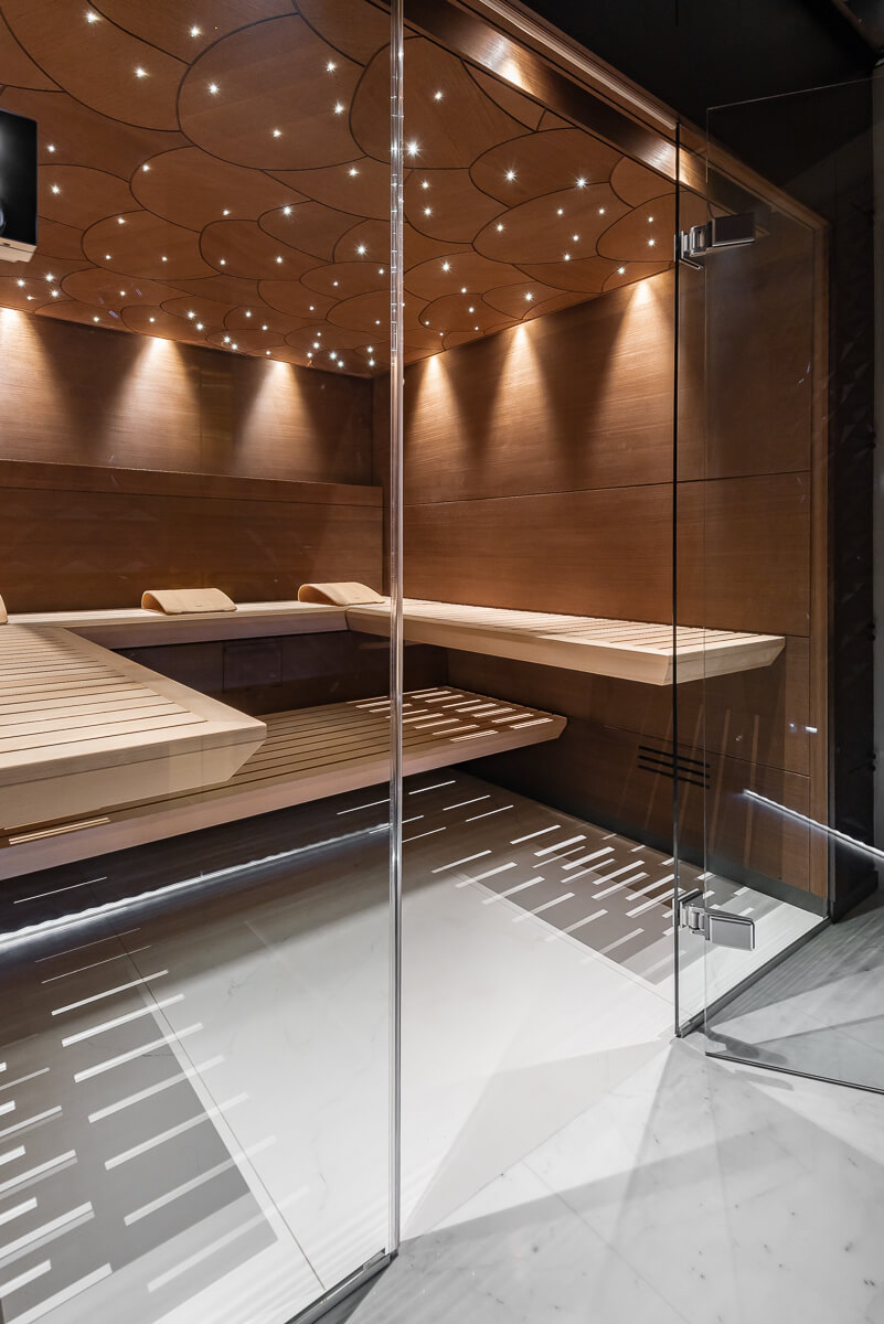 Лежаки: трехуровневые «парящие в воздухе» лежаки CASENA из гемлока. Максимальная ширина 70 см. Подспинники CASENA с двух сторон. Подголовники. Потолок: плоский, с теплоизоляцией. Отделка потолка Curve. Двери: 8 мм закаленное стекло c блочной дверной коробкой из алюминия EV1, дверная ручка — рейлинг из алюминия DUET.