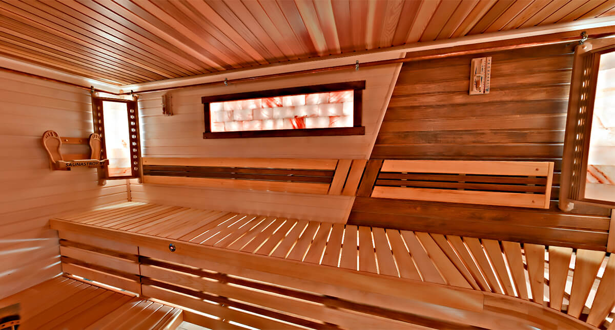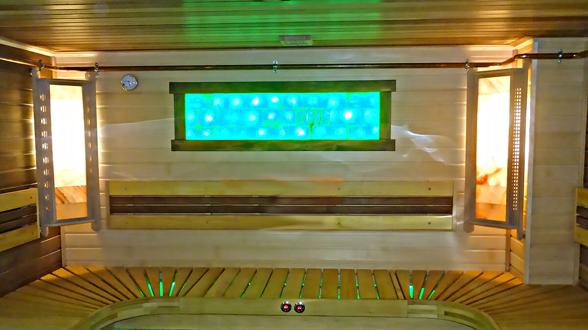 - цветотерапия с подсветкой полков, панно из гималайской соли на стенах парилки;