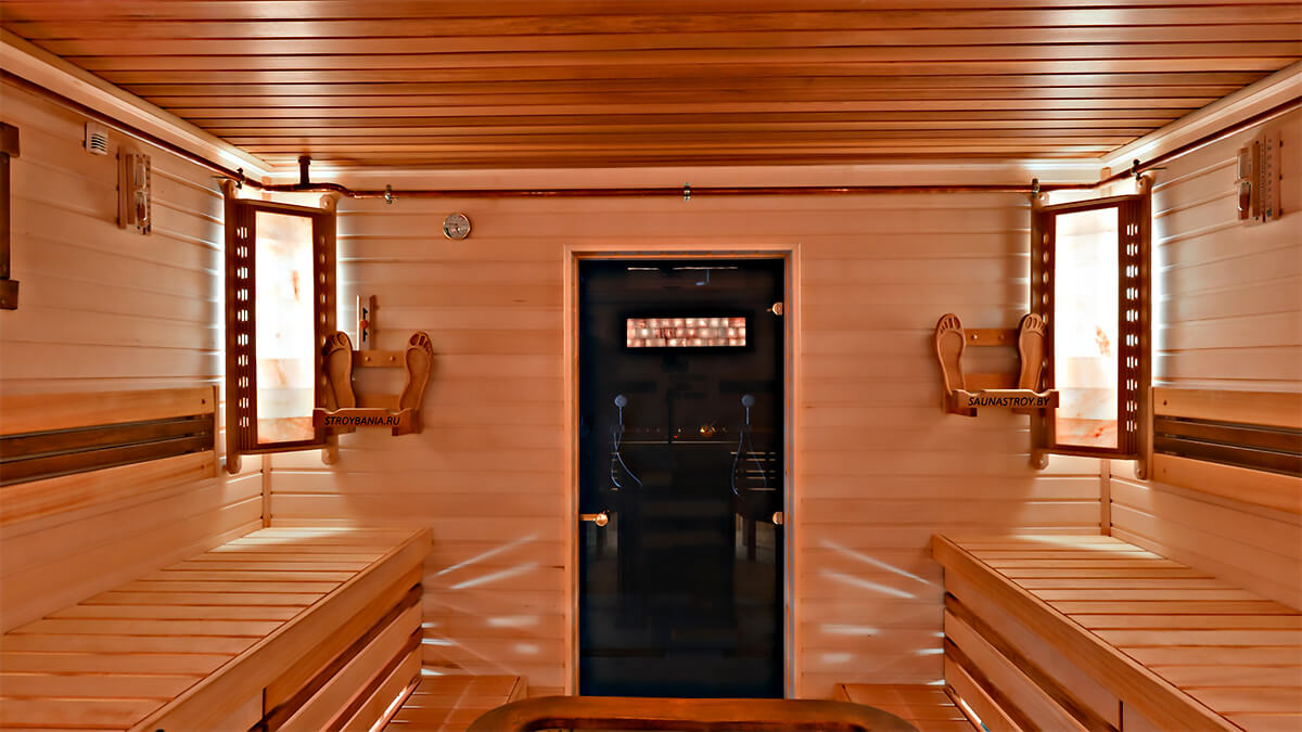 - потолок из вагонки из канадского кедра для усиления запаха при нагревании и выделения полезных веществ при парении;