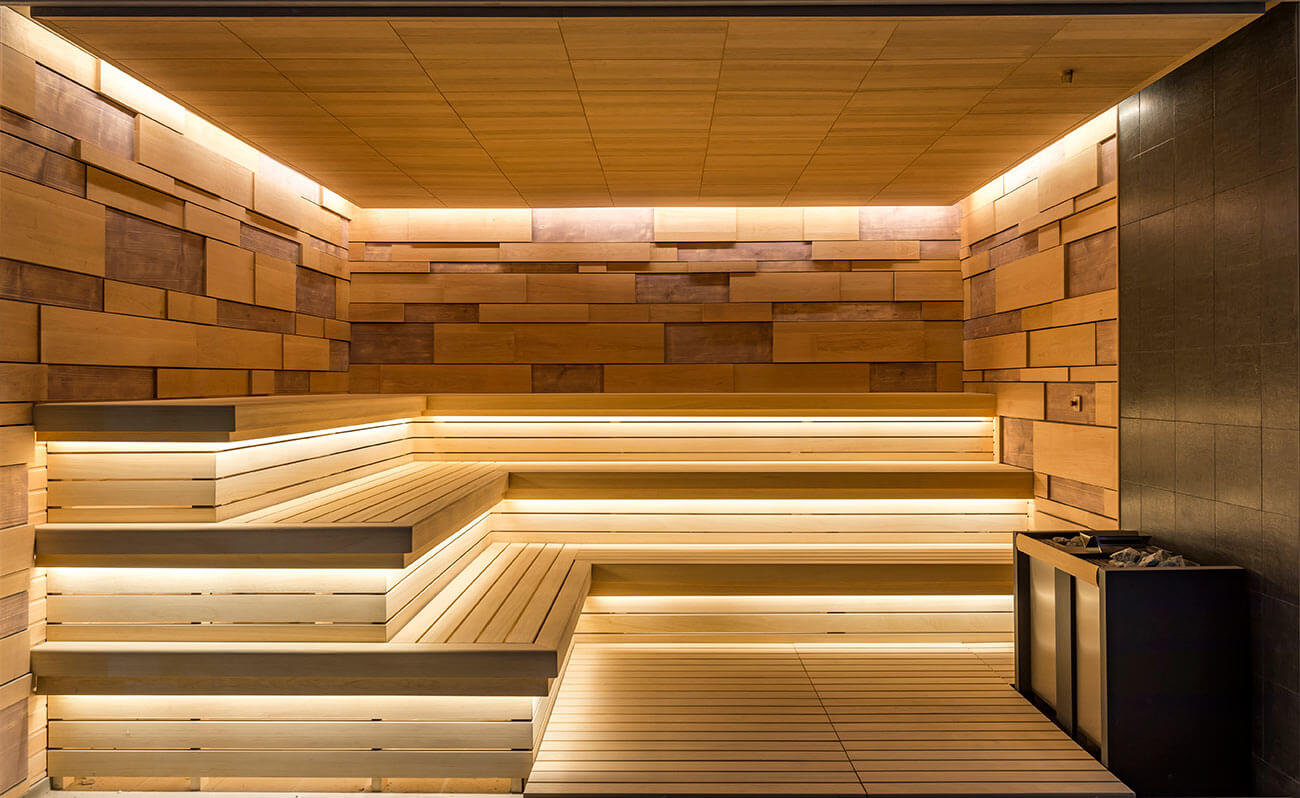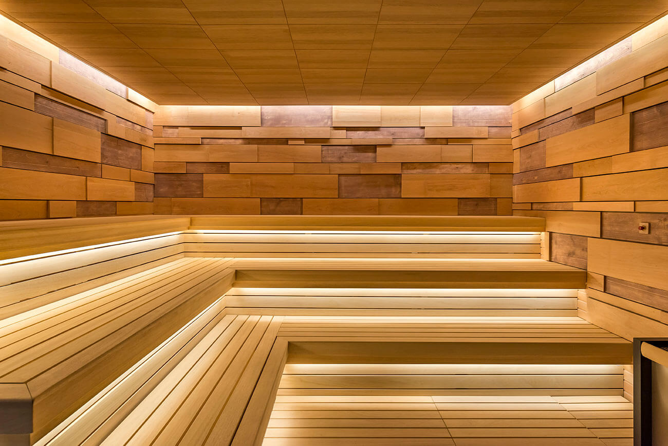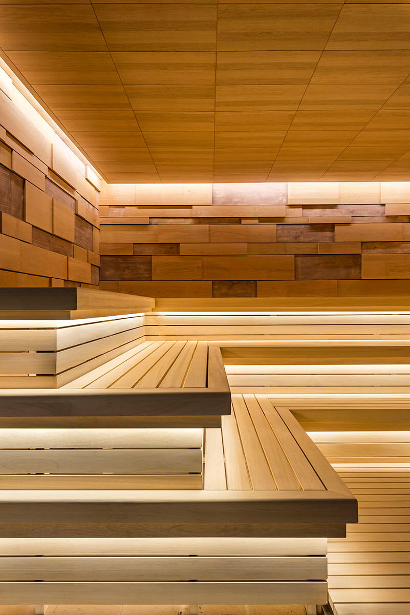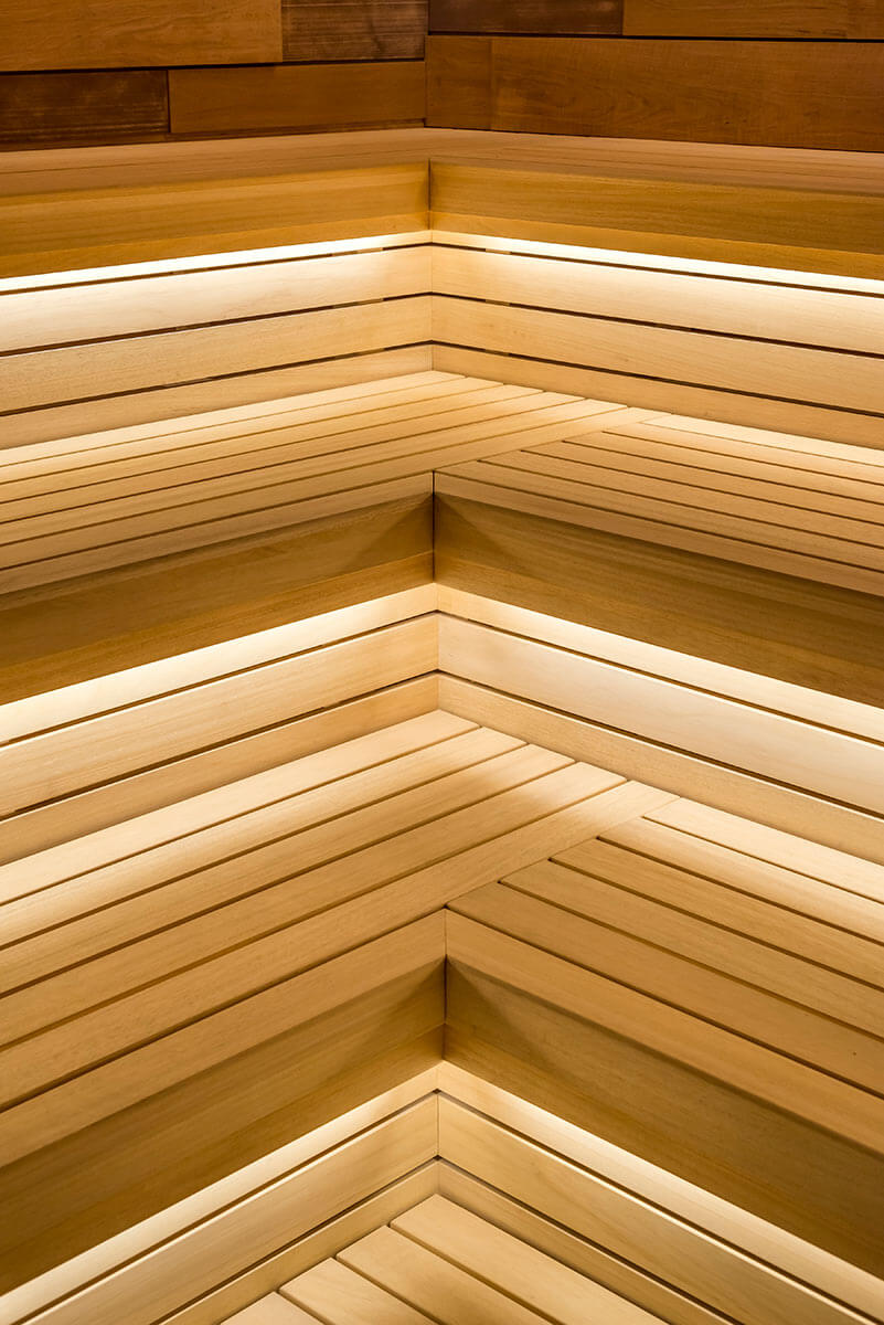 Массивные широкие лежаки с подсветкой изготовлены из африканского материала под названием абаш. Благодаря широким классическим (многоуровневым) полкам можно расположиться на любом уровне помещения, полежать или посидеть с друзьями, пообщаться и погреться при температуре 100°С, а также получить морально-эстетическое наслаждение от дизайнерского решения парной. Здесь очень комфортно любому члену семьи и не только!