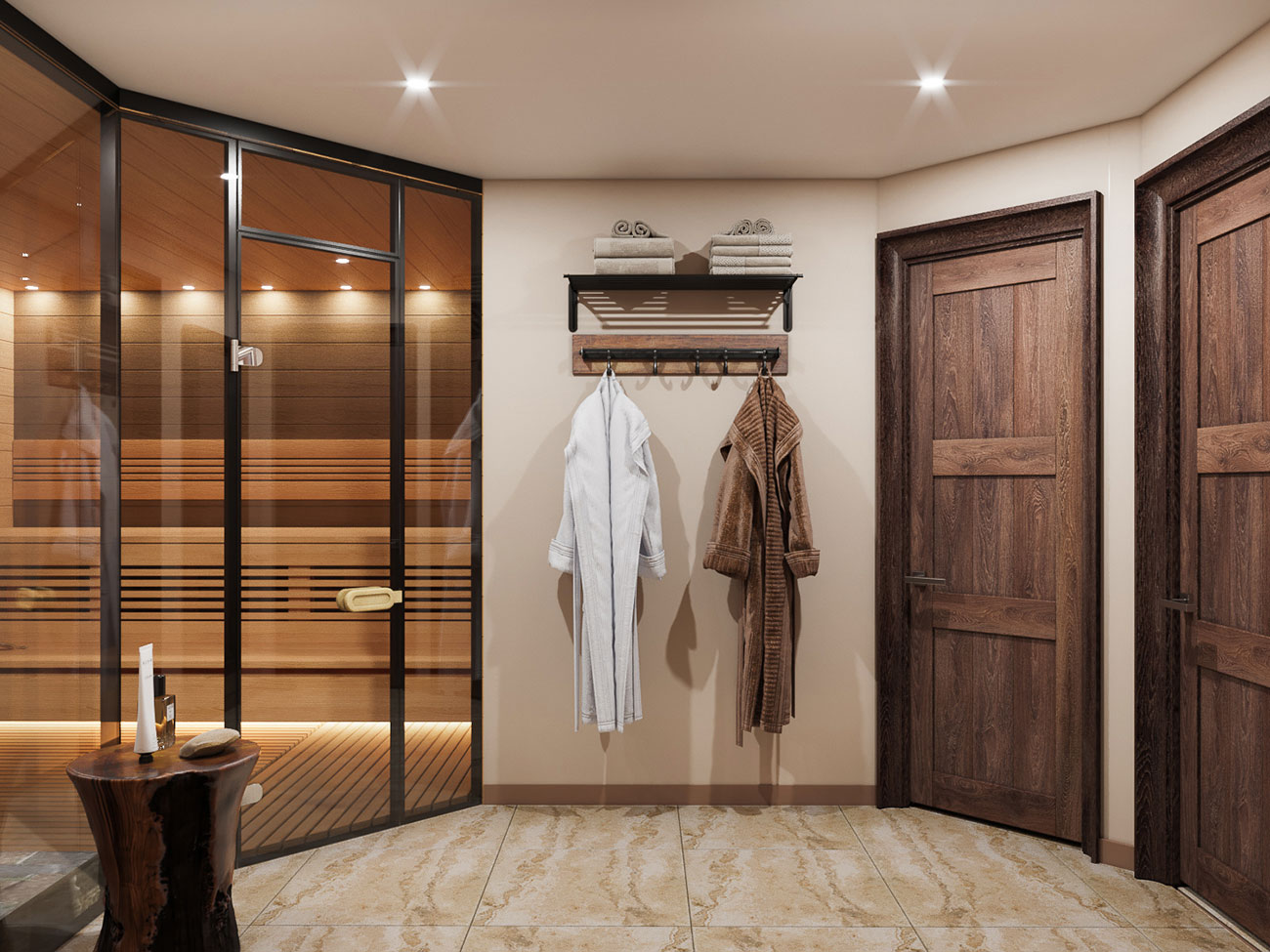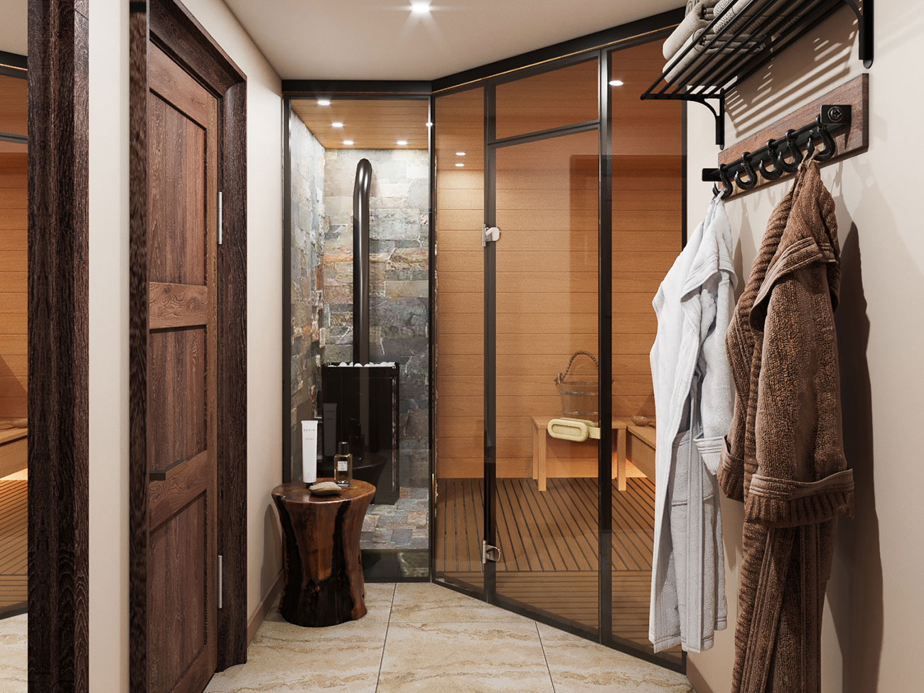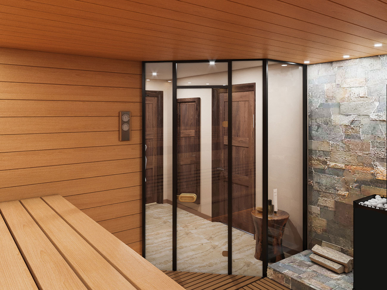 Витражная стена с переходом в распределительный тамбур визуально расширяет пространство сауны и является эстетически выразительной деталью интерьера.