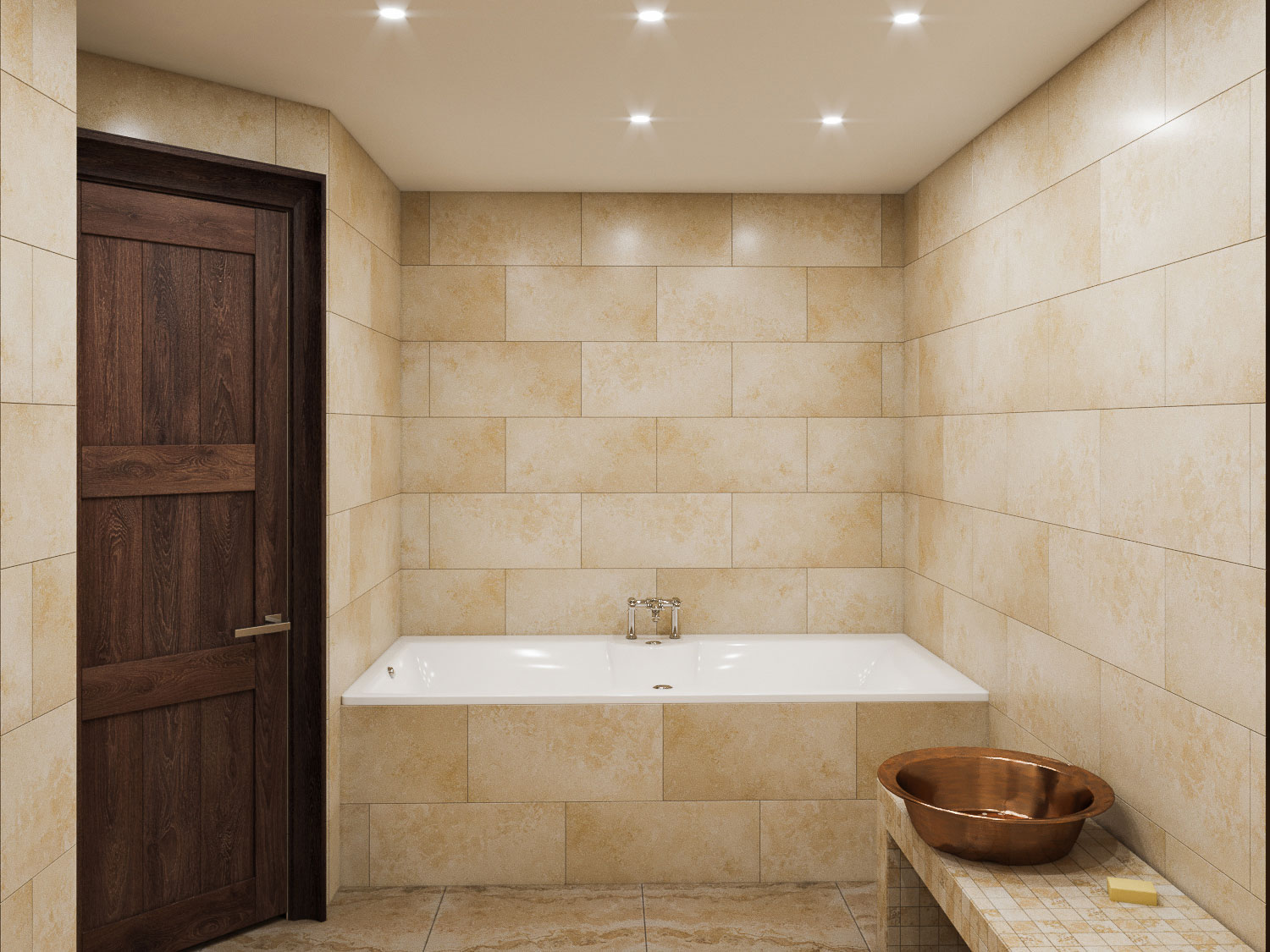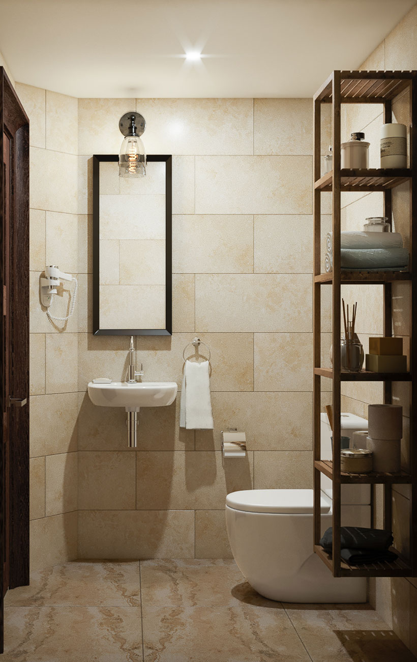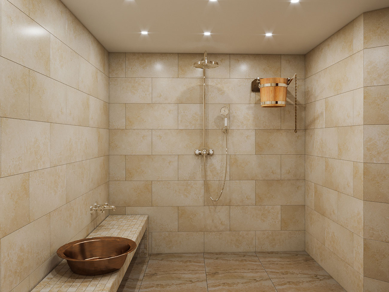 Из сауны хозяева переходят в душевую комнату с ванной и обливным ведром. Напольное покрытие и стены душевой выполнены из керамогранита с текстурой натурального камня, который создает теплую и уютную атмосферу. Все помещения бани подчинены единой стилевой концепции.