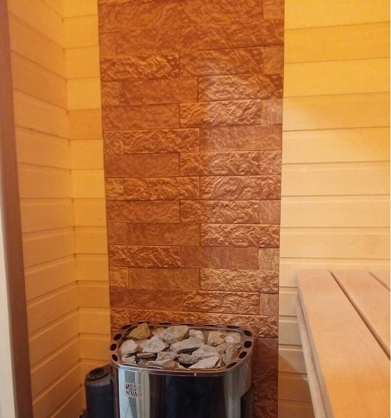 Пол в помещении с электрическим подогревом. По периметру вдоль стен на 65 мм по высоте смонтирован «сапожок» из плитки «Терракот». Из этой же жаропрочной плитки изготовлена декоративная стена, на которую монтируется каменка.