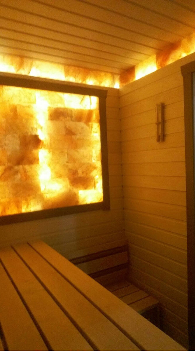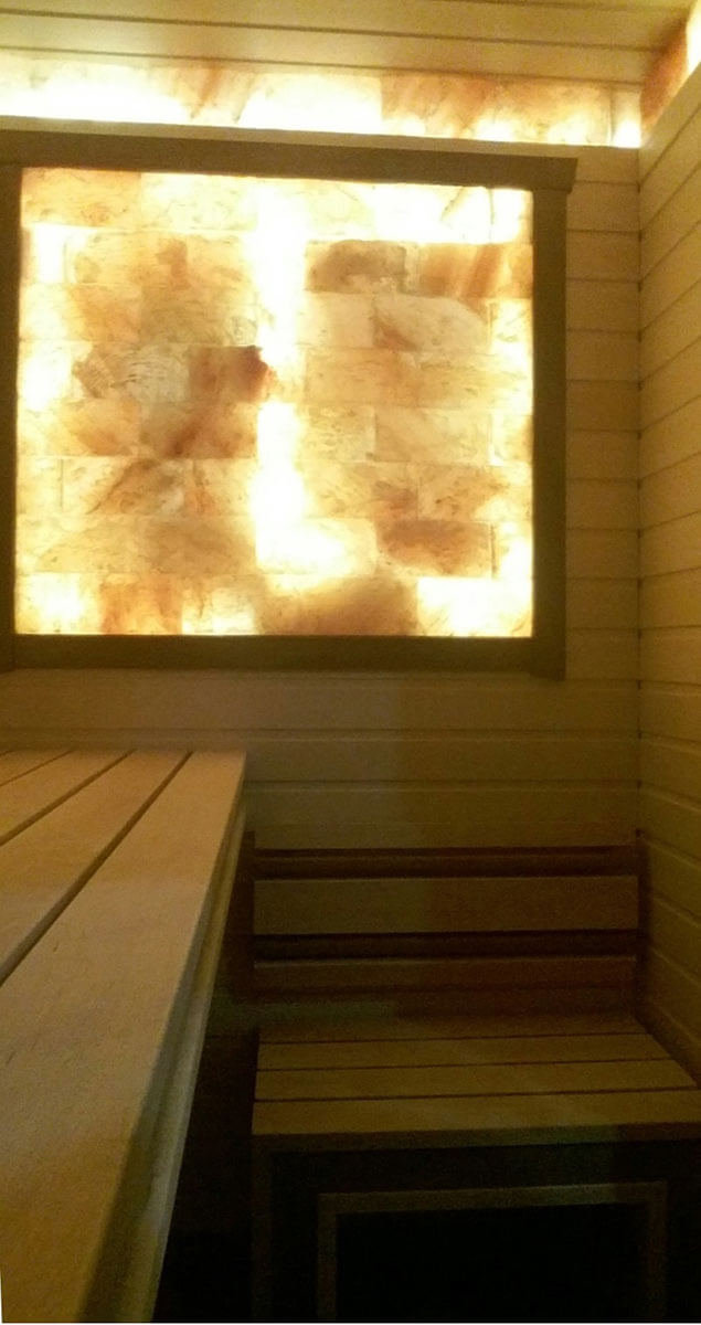 Периметр потолка, как и панно на стене, выложены из цельного кирпича гималайской соли.