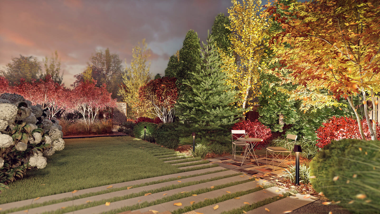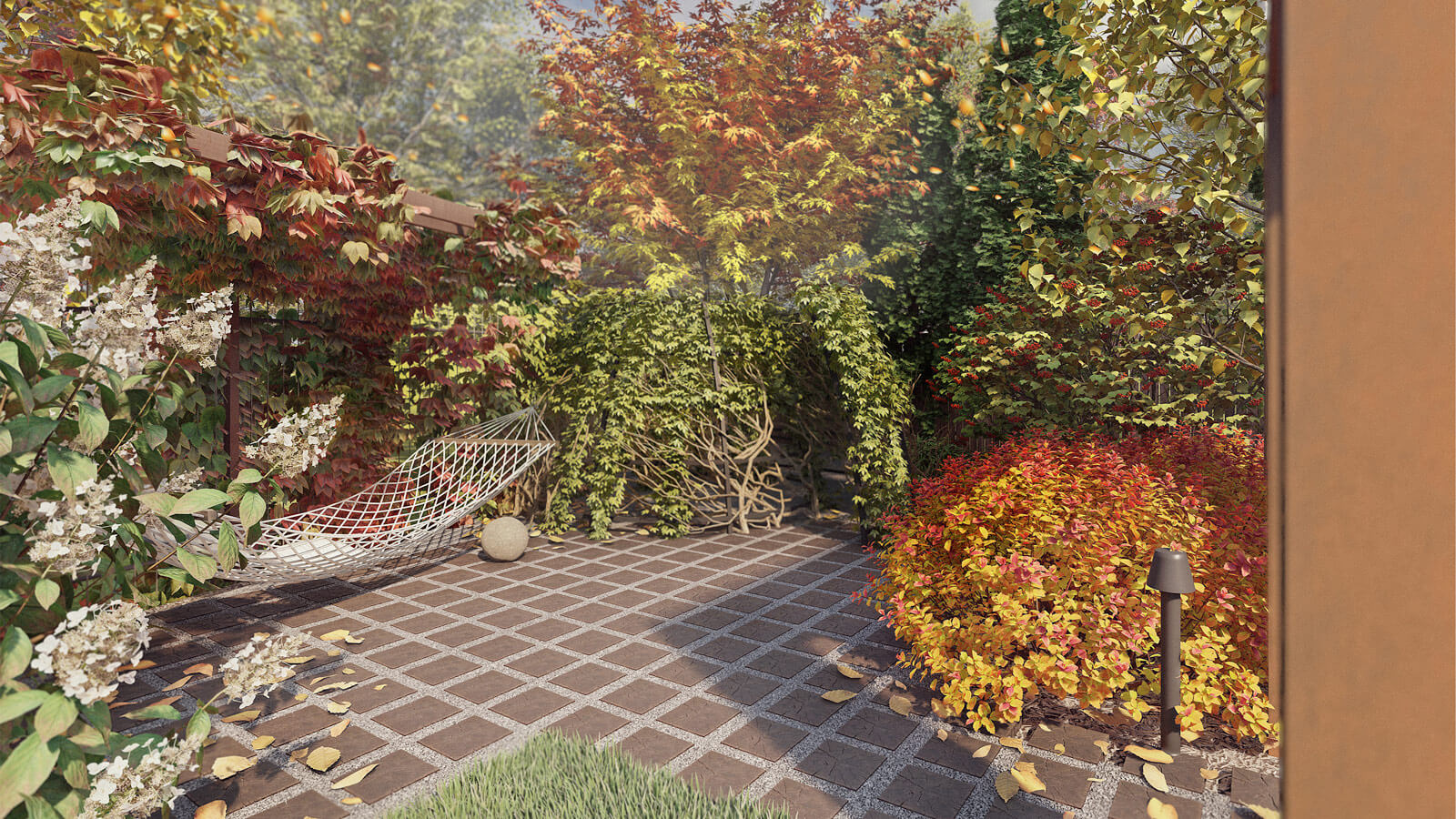 Растения в саду подобраны с акцентом на осеннюю декоративность — это то время года, когда семья чаще собирается на даче, приезжая из отпусков и каникул. Осенняя декоративность деревьев, кустарников, цветов и трав перекликается с лесным массивом, практически образуя единое пространство.