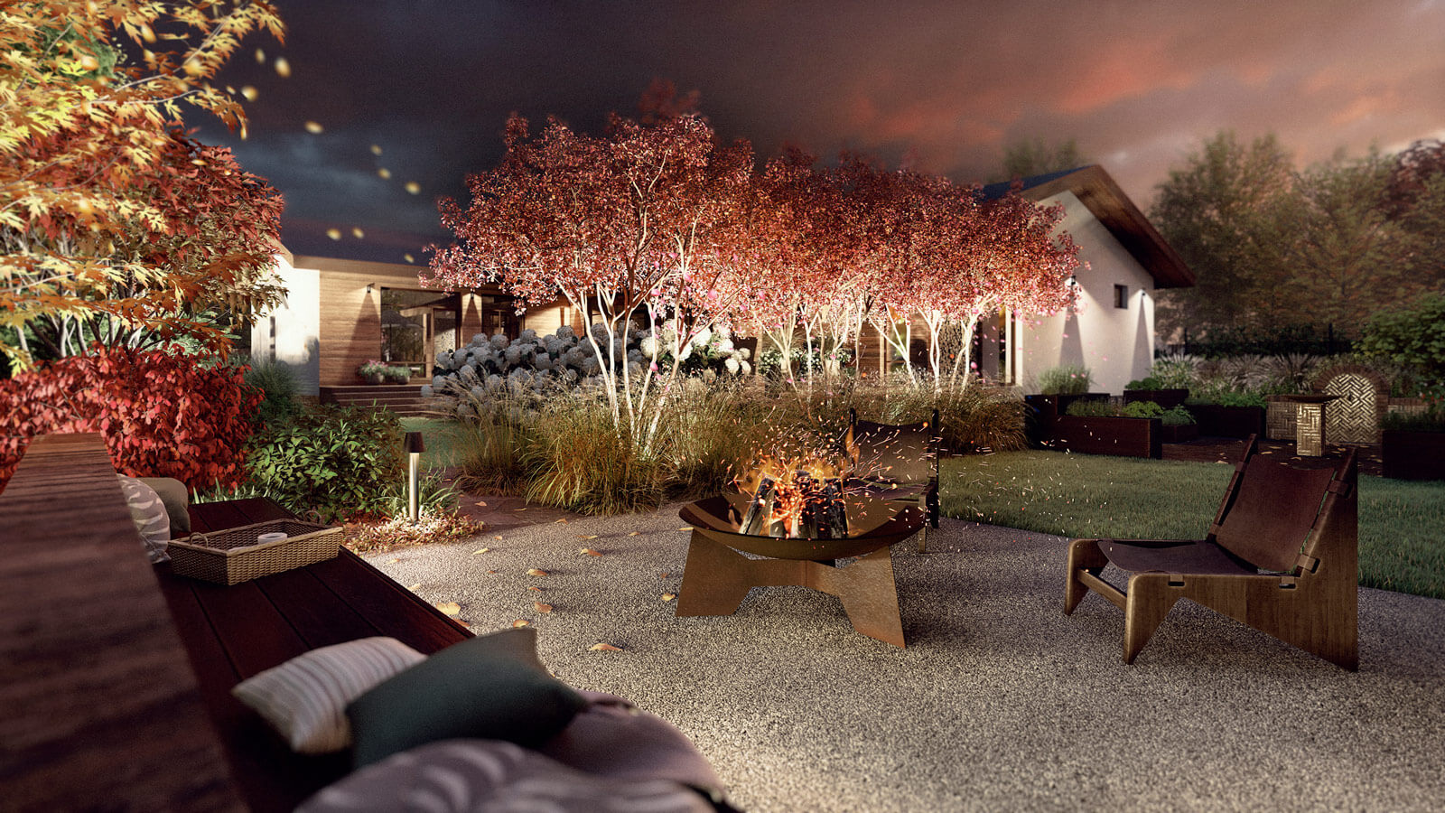 Местом притяжения гостей и всей семьи в вечернее время послужит площадка с костром, мебель на которой так же будет изготовлена по авторскому проекту. Ну а дровница является не только арт-объектом, но и настоящим порталом на детскую площадку — тоже своеобразную садовую «комнату».