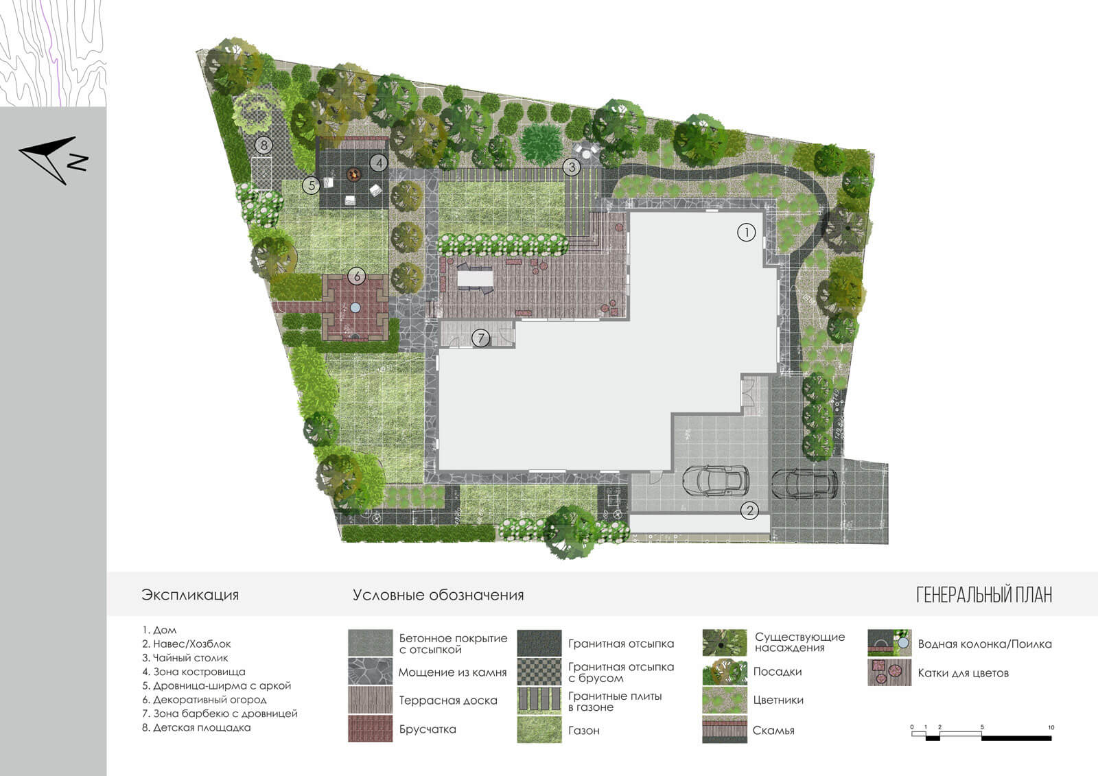 Проект сада для трех поколений семьи со своими традициями и ценностями разрабатывался на основании пожеланий и потребностей всех ее членов. Семья большая, интересы совершенно разные: в задачи проектирования входило объединить все потребности членов семьи, их разнообразные интересы, дать им возможность как объединиться за обеденным столом в знойный день, так и остаться один на один со своими хобби и дать им возможность уединенного отдыха.