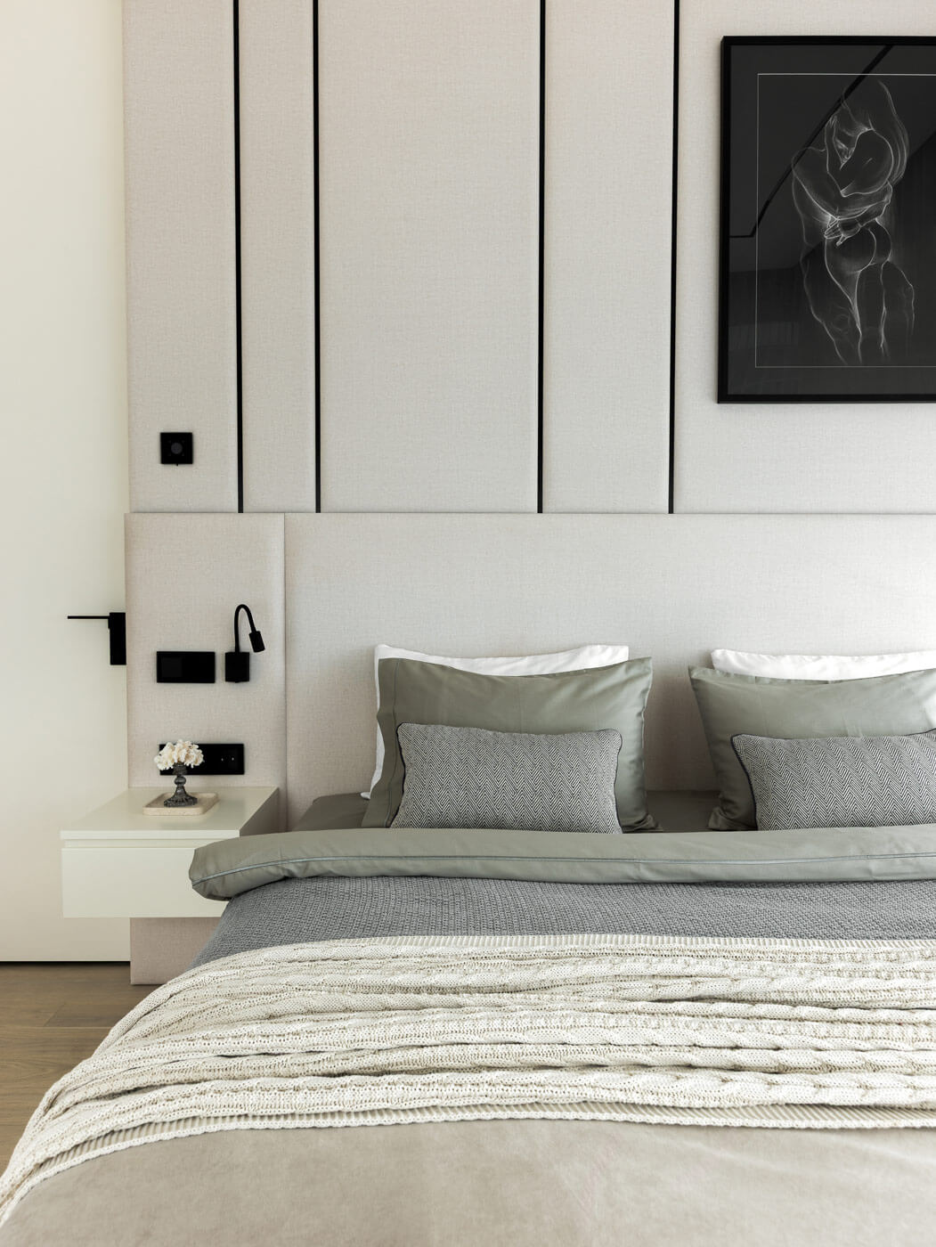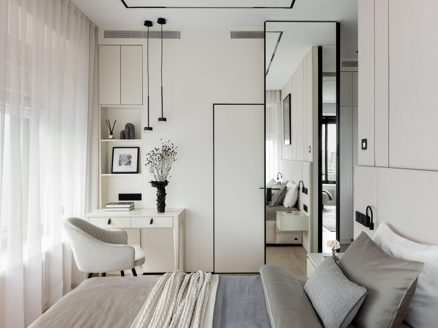 В спальне родителей особое внимание привлекает кровать с оригинальным панно, украшенным черным декором, а также элегантный столик, служащий удобным рабочим местом. Планировочным решением предусмотрена гардеробная комната, благодаря чему спальня родителей свободна от громоздких шкафов. Поскольку кухня-гостиная расположена близко к спальне, разместили дверь скрытого монтажа с зеркальным полотном и декором, благодаря чему она незаметна в основном пространстве.