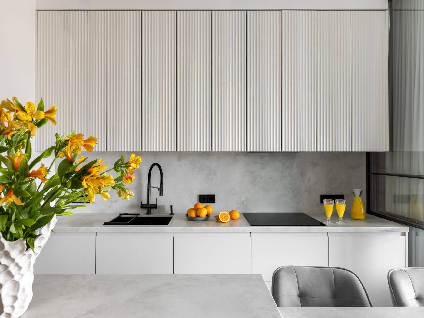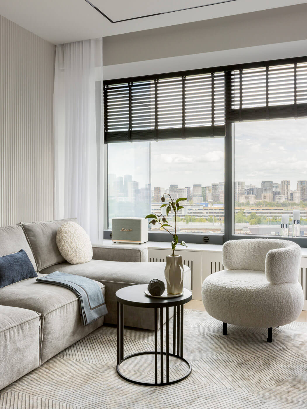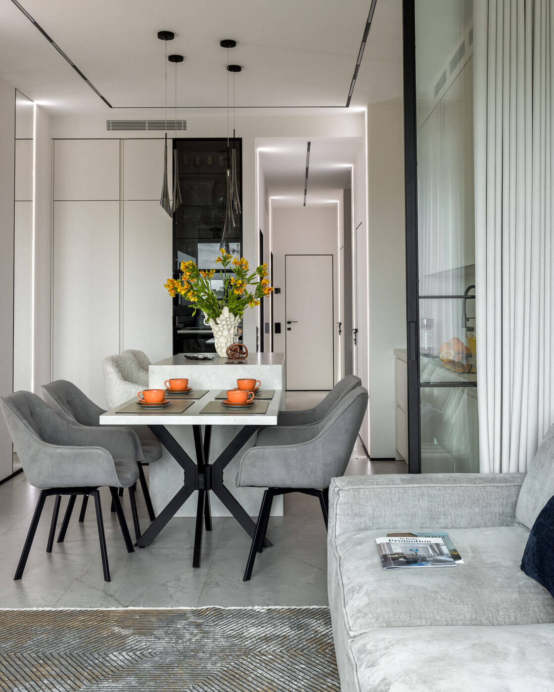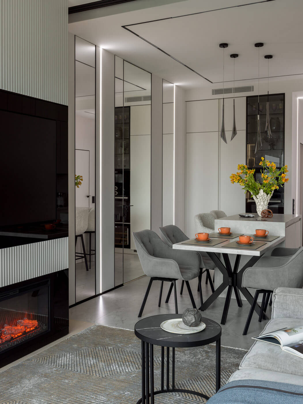 Сердце квартиры — просторная кухня-гостиная, залитая естественным светом из большого углового окна с завораживающим видом на Тюфелеву рощу. Здесь расположен современный камин, добавляющий тепла и уюта, а ТВ-зона оборудована продуманными системами хранения. В кухне-гостиной также использовали минималистичный вертикальный декор в виде рельефных 3D панелей, встраиваемых световых полосок и черных алюминиевых элементов, задающих динамику и подчёркивающих современный стиль помещения. Такой прием визуально удлиняет стены, создаёт эффект глубины и добавляет интересную текстуру, сохраняя при этом лёгкость и сдержанность интерьера.