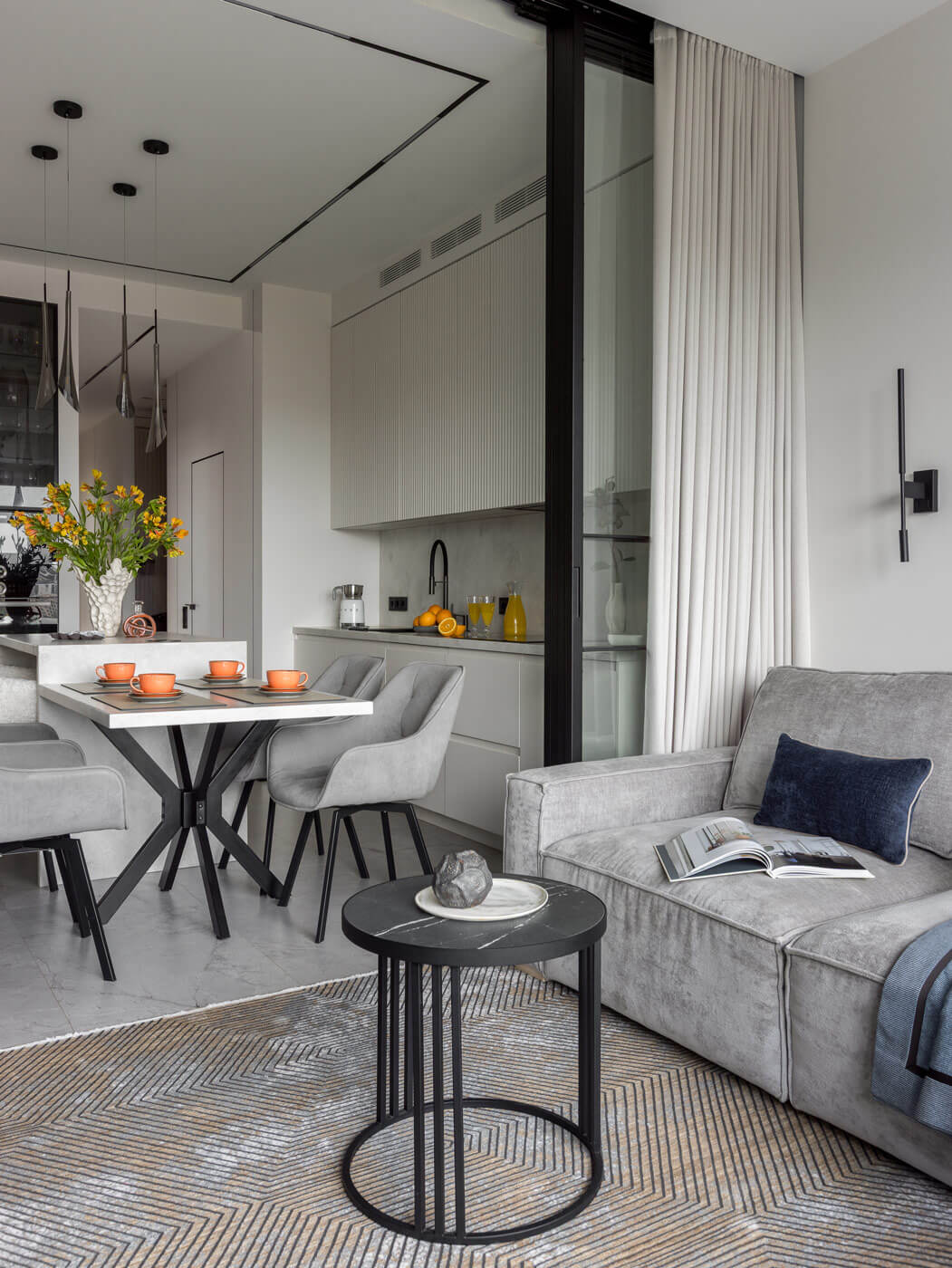 Функциональная кухонная зона включает в себя остров с полубарной стойкой, а также большой обеденный стол для всей семьи. Кухня и гостиная разделены элегантной стеклянной перегородкой со шторами.