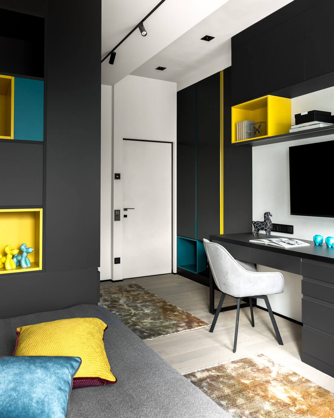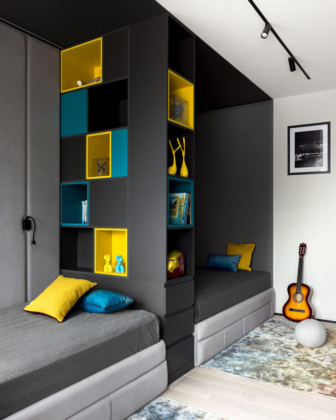 Детская комната, предназначенная для двух подростков 10 лет, выполнена в сдержанных серых тонах с яркими акцентам. Зонирование сделано таким образом, чтобы у каждого из детей было собственное пространство для отдыха, учебы и игр. В зоне оконного блока, где есть свободное пространство и высокие подоконники, разместили мягкие сидячие зоны с декоративными экранами для радиаторов. В некоторых местах удалось предусмотреть дополнительные места для хранения.
