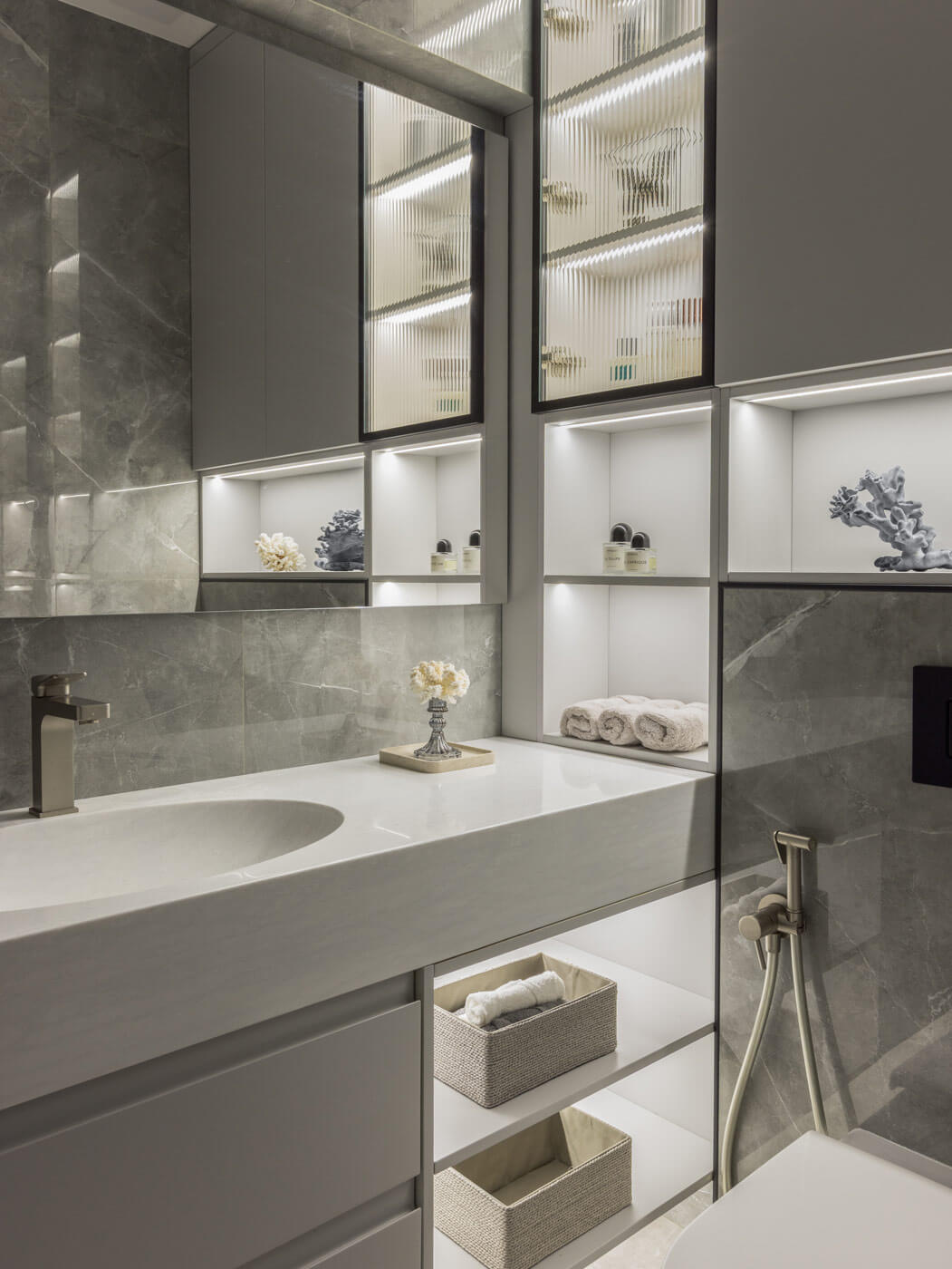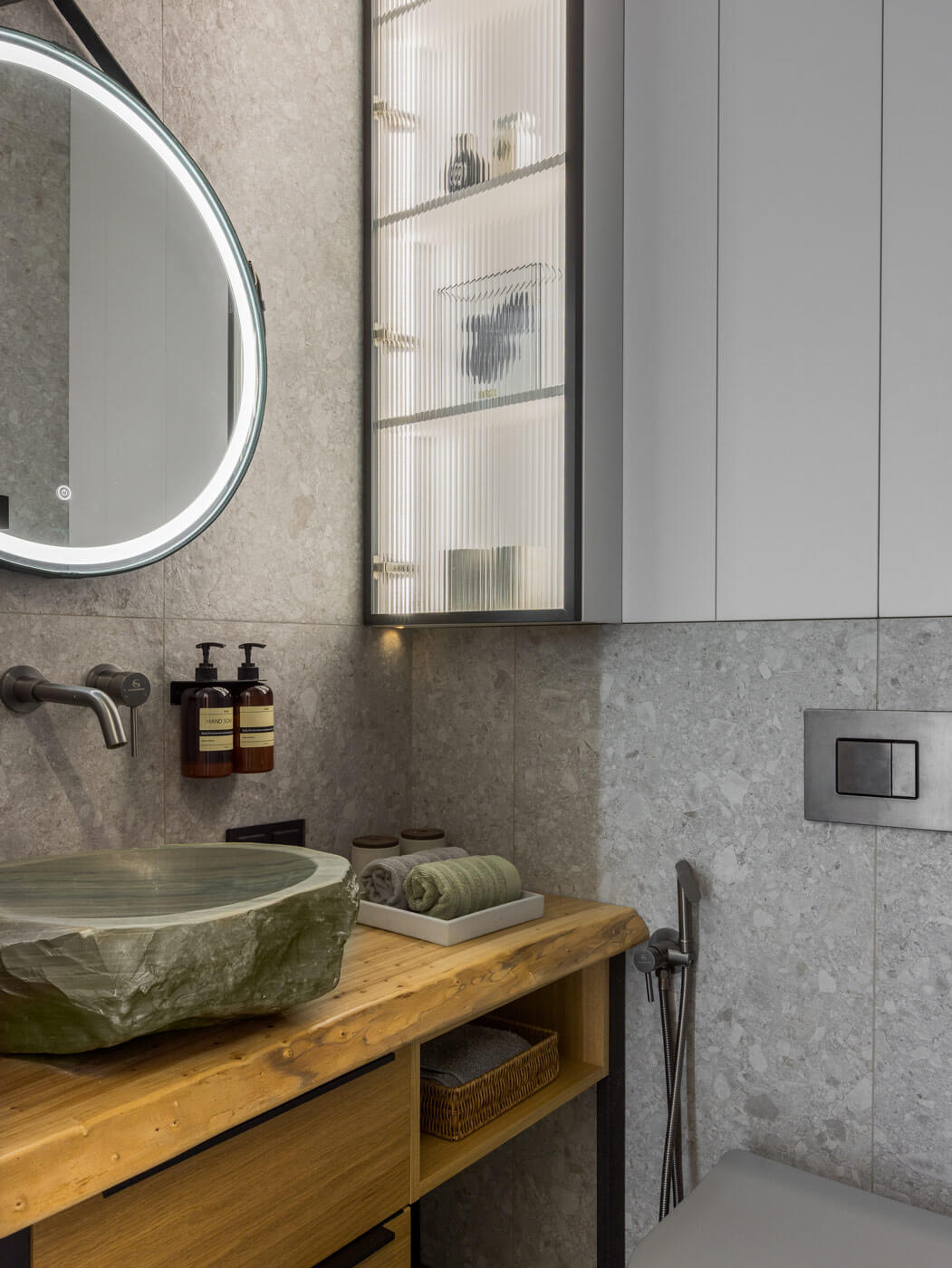 Санузлы оформлены в серой цветовой гамме, однако с разным дизайнерским подходом. Маленький санузел отделан матовой керамогранитной текстурной плиткой. В нем установлена тумба со столешницей из слэба карагача и раковиной из речного камня. Большой санузел оформлен глянцевой плиткой, оснащен большой столешницей с интегрированной раковиной из акрилового камня и большим зеркалом с интерьерной подсветкой. В нем размещена душевая кабина с сиденьем и скрытой нишей с декоративными полосками для косметических средств. В соответствии с планировочным решением стиральную и сушильную машины расположили в отдельной постирочно-гардеробной комнате, позволяя сэкономить пространство в санузлах.
