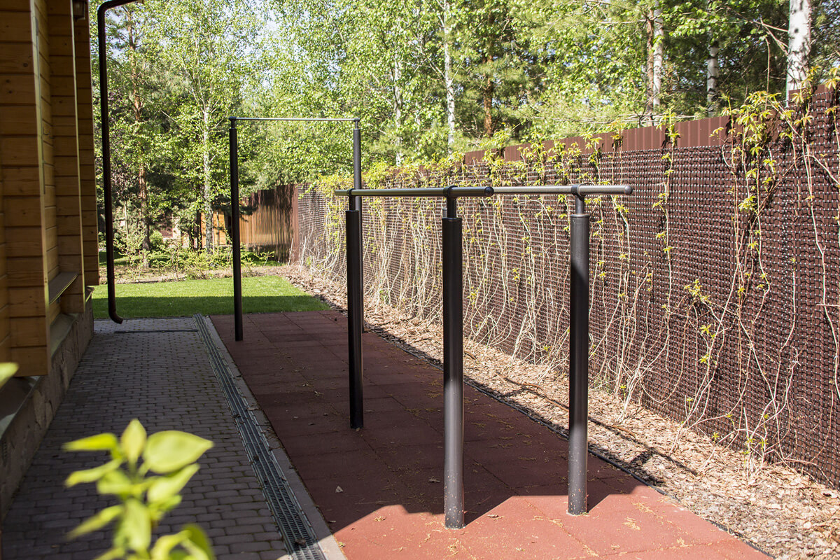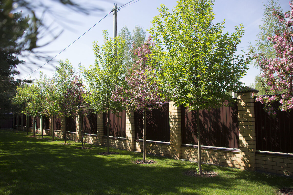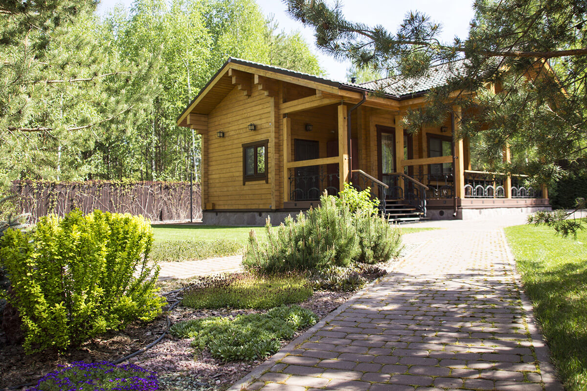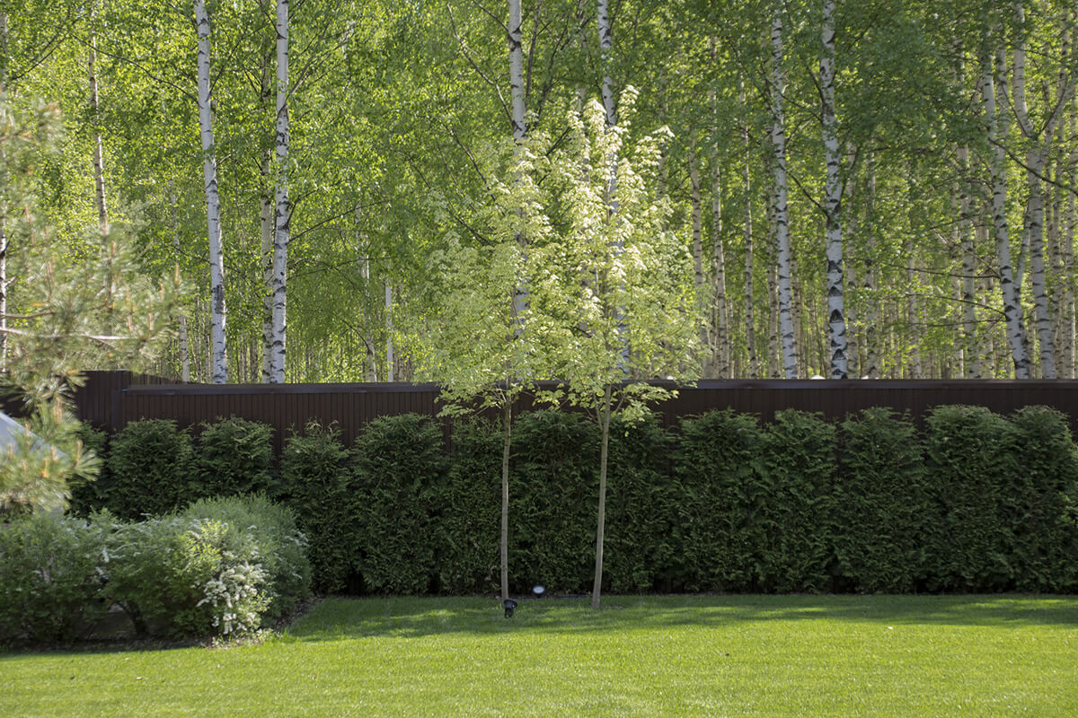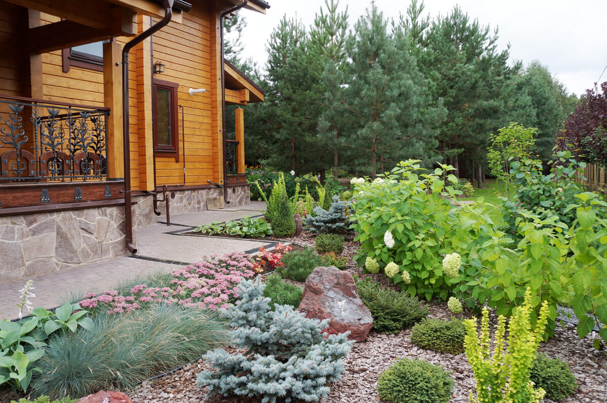 В оформлении территории использованы неприхотливые, максимально адаптированные к нашим климатическим условиям растения. Под пологом сосен высаживались растения, которые выносят полутень и предпочитают кислые почвы. К ним относятся рододендроны, бересклеты, верески, эрики, голубика, брусника, виды и сорта гортензии. Все декоративные растения на участке мульчировались корой сосновой. Мульчирующий слой предохраняет почту от пересыхания, перегрева и одновременно служит прекрасным удобрением.