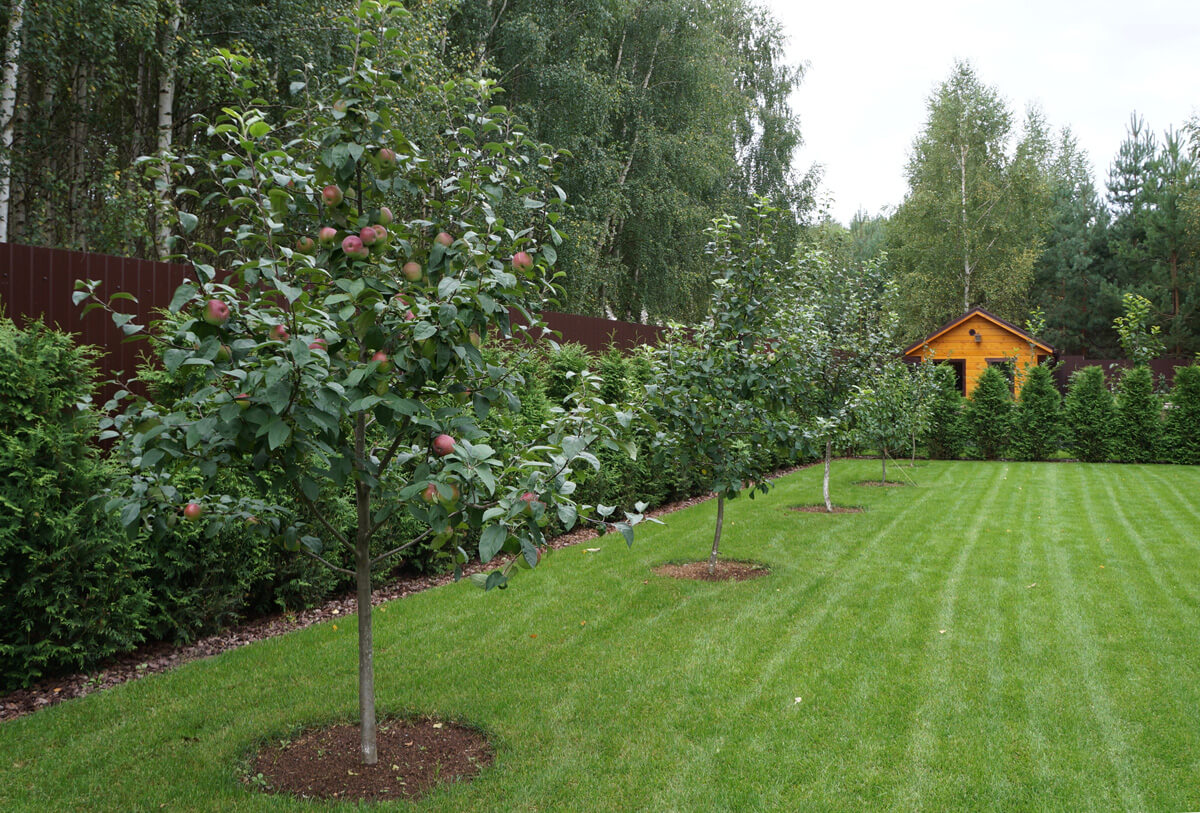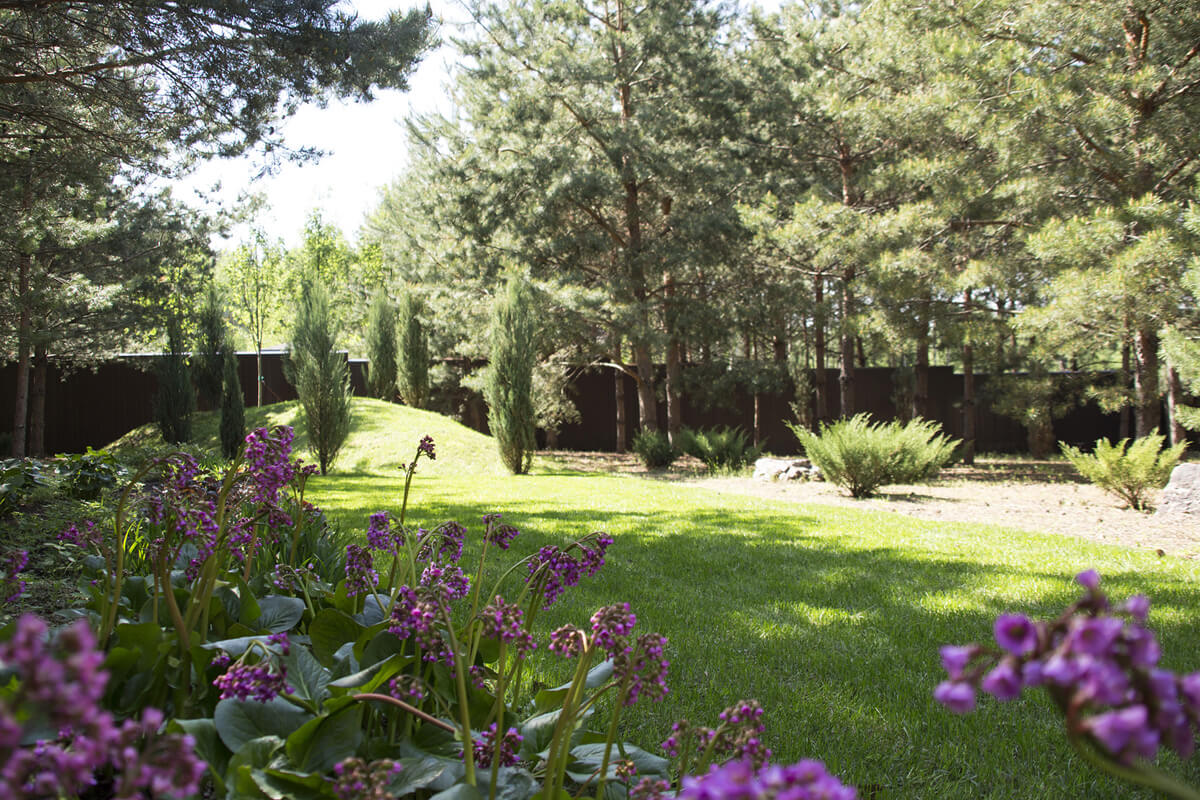 Сад выполнен в пейзажном стиле и находится на территории хвойного леса. Зеленые языки газона пробираются сквозь хвойные заросли и связывают территорию в единую, объемно-пространственную структуру. Плотный зеленый ковер служит фоном для древесно-кустарниковых и цветочных композиций. Травянистые растения не только обогащают среду, придавая ей колористическое многообразие, повышают ее эстетическую и эмоциональную насыщенность, но и дополнительно обогащают воздух кислородом, снижают температуру воздуха в летние жаркие дни.