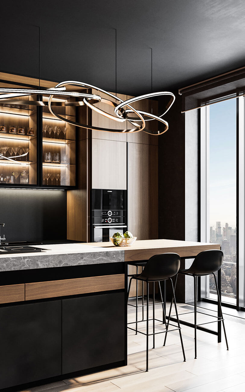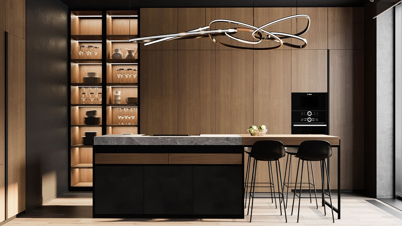 Гостиная объединена с кухней. На кухне отказались от стола в пользу острова с барными стульями. Плита и вытяжка находятся на острове. Кухня имеет закрывающиеся створки и при необходимости становится «невидимой».