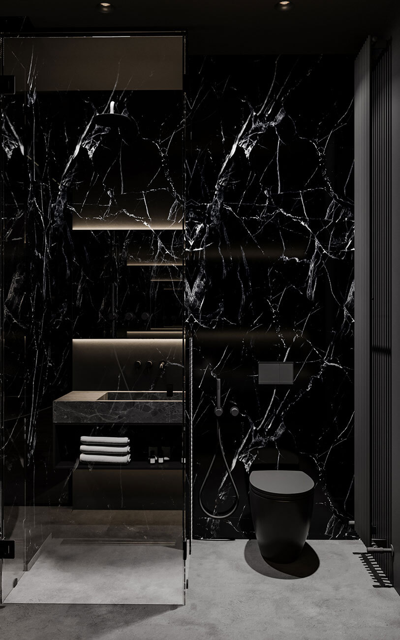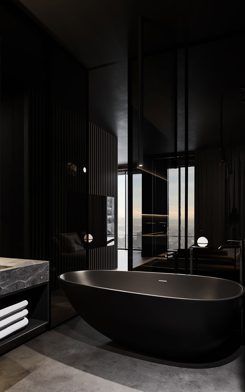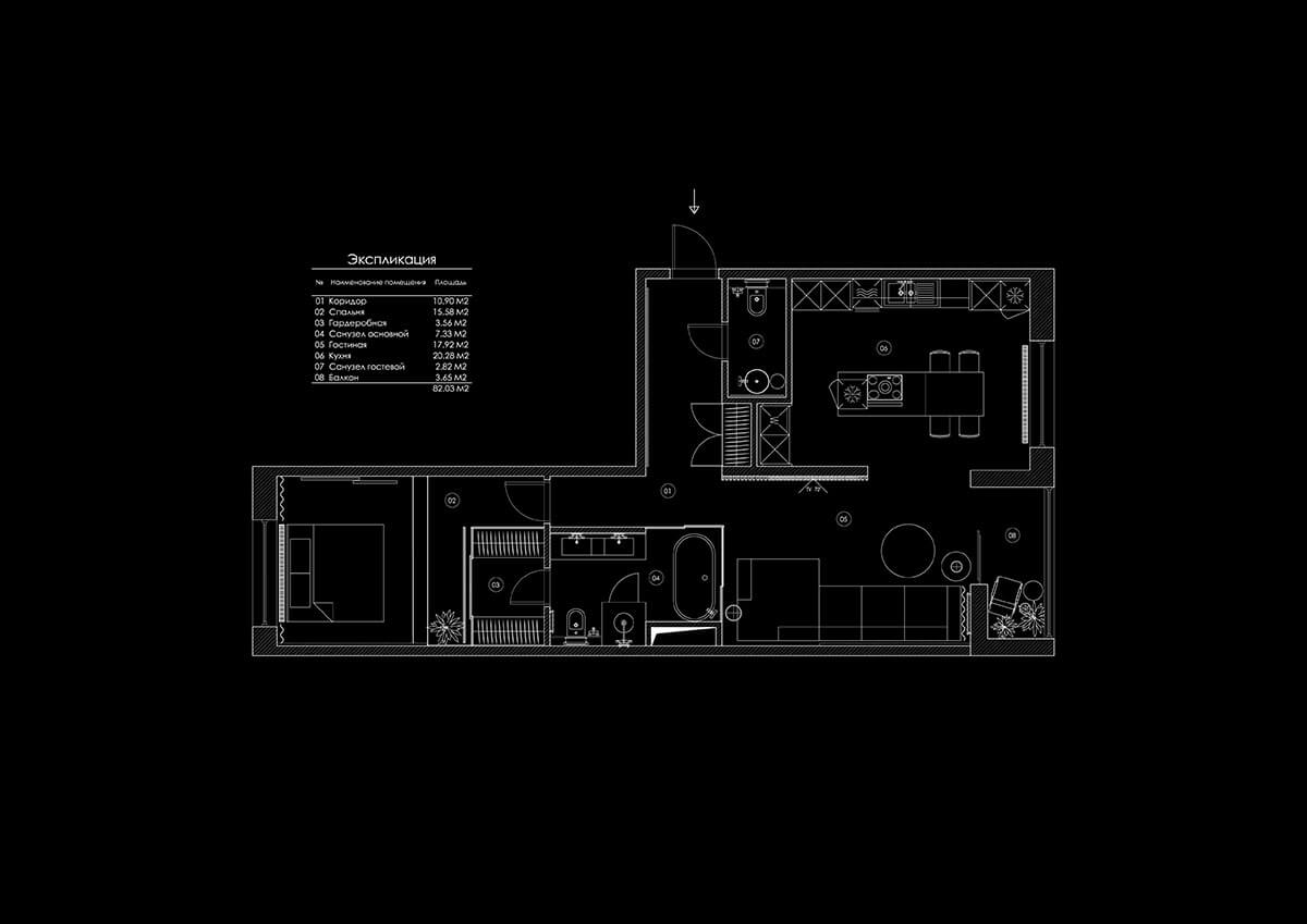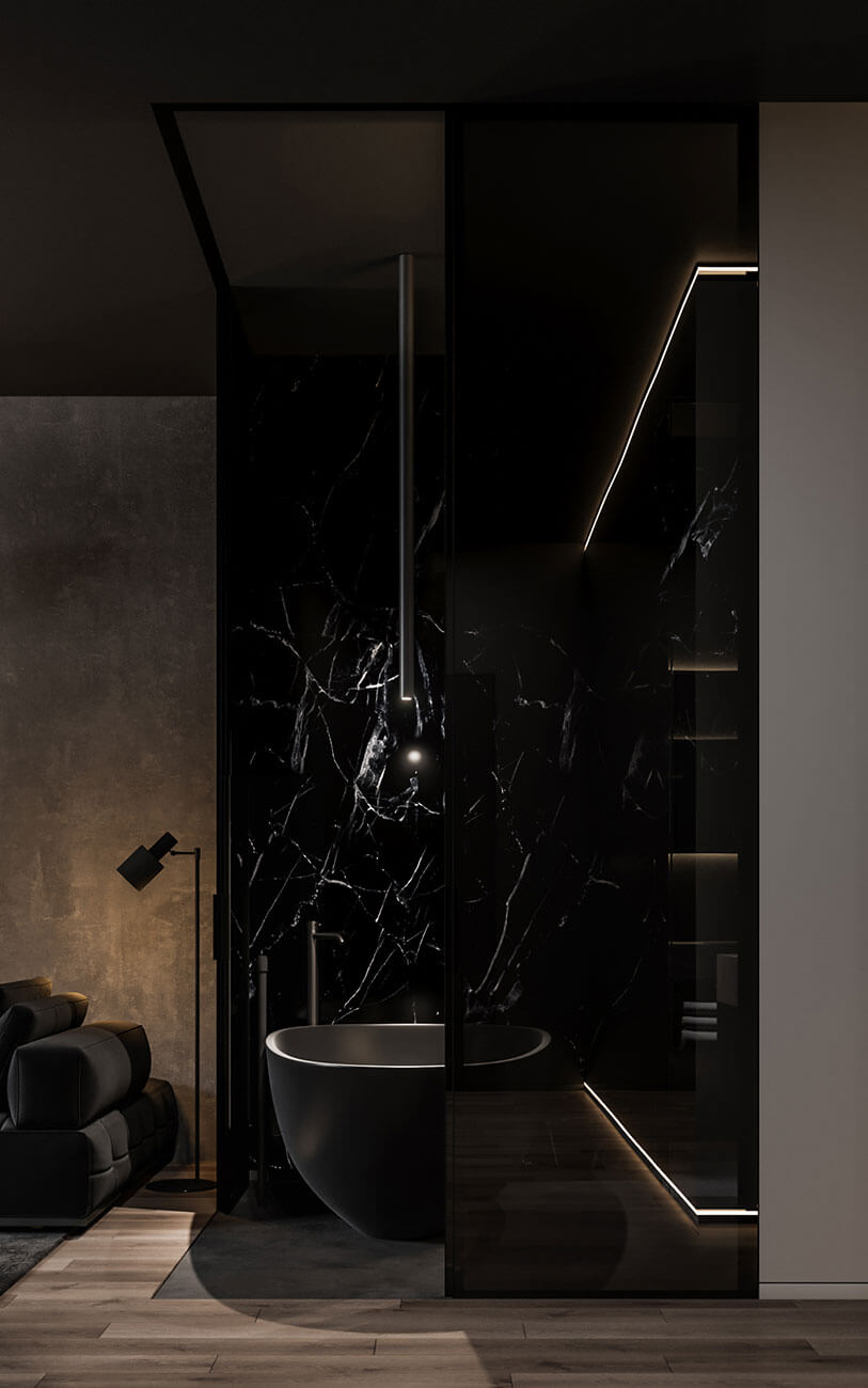 Из спальни в гостиную можно попасть двумя путями: через межкомнатную дверь или через гардероб и ванну. Ванная комната отделяется от гостиной стеклянными раздвижными перегородками. Их можно полностью раздвинуть и смотреть ТВ из ванны, можно закрыть, но оставить прозрачными, а можно зонировать пространство, замотировав стекло.