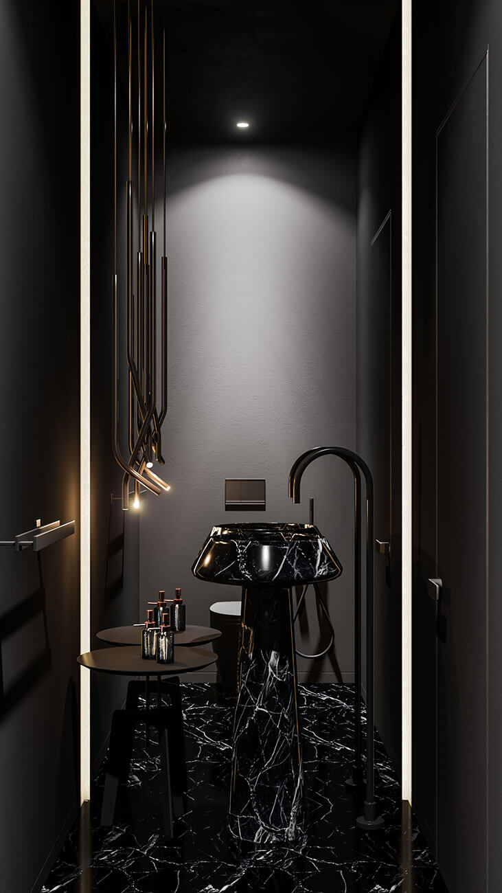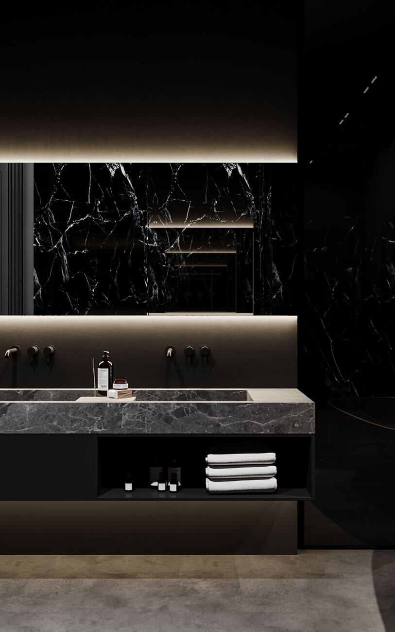Пожелание — сделать трансформирующееся пространство с максимальным использованием темной цветовой гаммы и разноуровневой подсветки, установить систему умный дом.