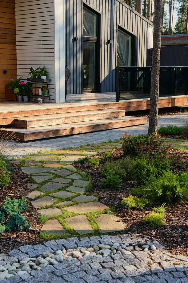 Природные второстепенные дорожки образуют кольцевой маршрут и ведут к различным уголкам участка, создавая возможность исследовать его вдоль и поперек. Они вписываются в окружающую природу и сохраняют ее естественность. Эти дорожки вписываются в ландшафт за счет природного камня-песчаника, который пересекает лужайку.