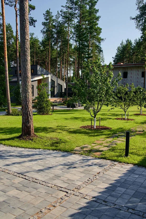 Лесная зона занимает значительную часть участка и плавно перетекает с прилегающей территории на задний двор. из-за большего лесного покрова, мы выбрали максимальное сохранение леса и внедрение его в новый ландшафт.