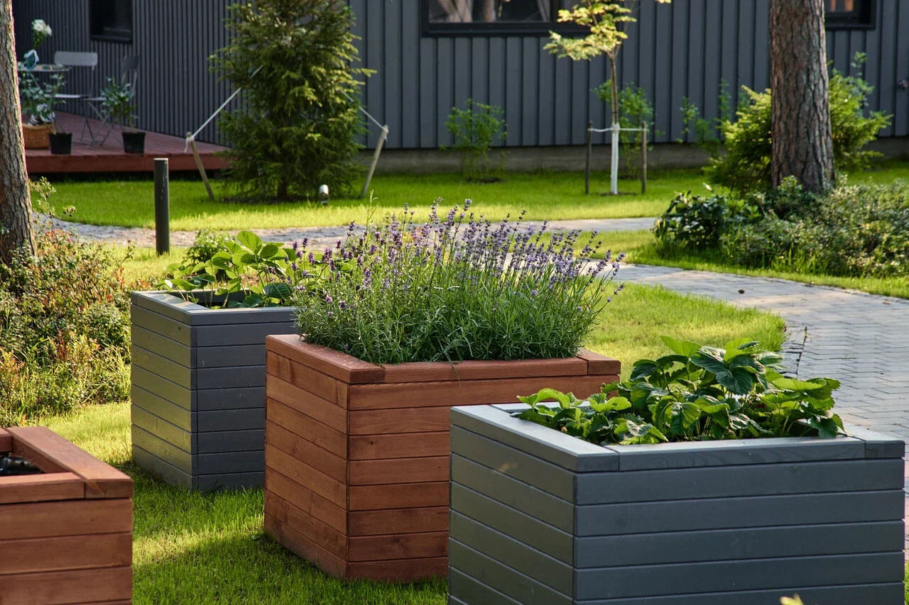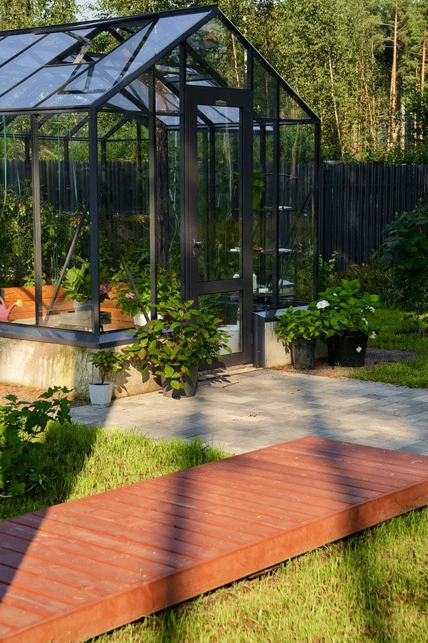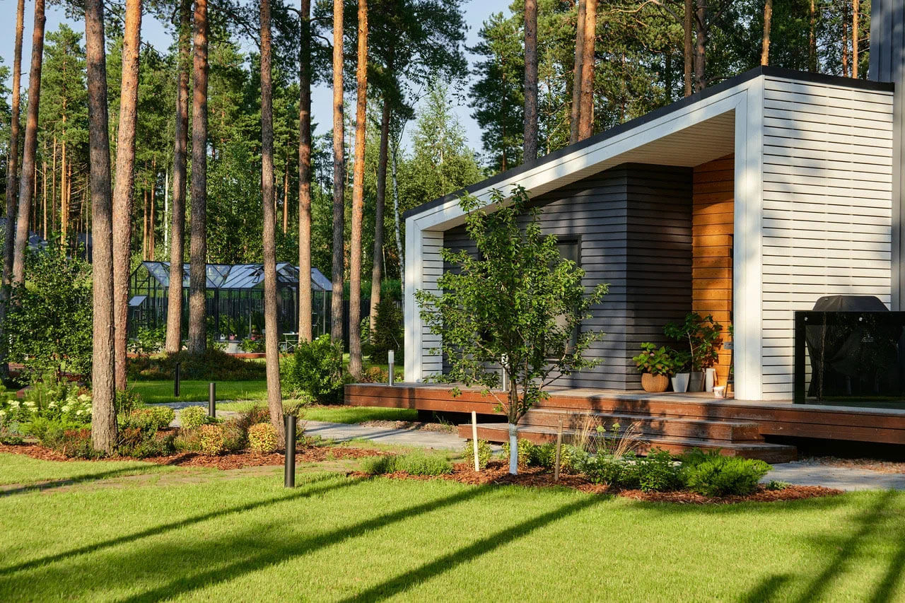 Зеленая трава и яркие цветы вокруг всего этого создают красочный и живописный вид, который радует глаз и поднимает настроение. Цветочные композиции и плодовый сад с огородом, являлись основными пожеланиями заказчиков, так как они любят выращивать растения и ухаживать за ними. Грядки в деревянных кашпо и теплица — это место, где хозяева выращивают свои собственные овощи и фрукты.