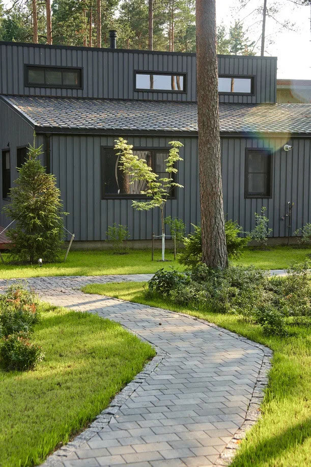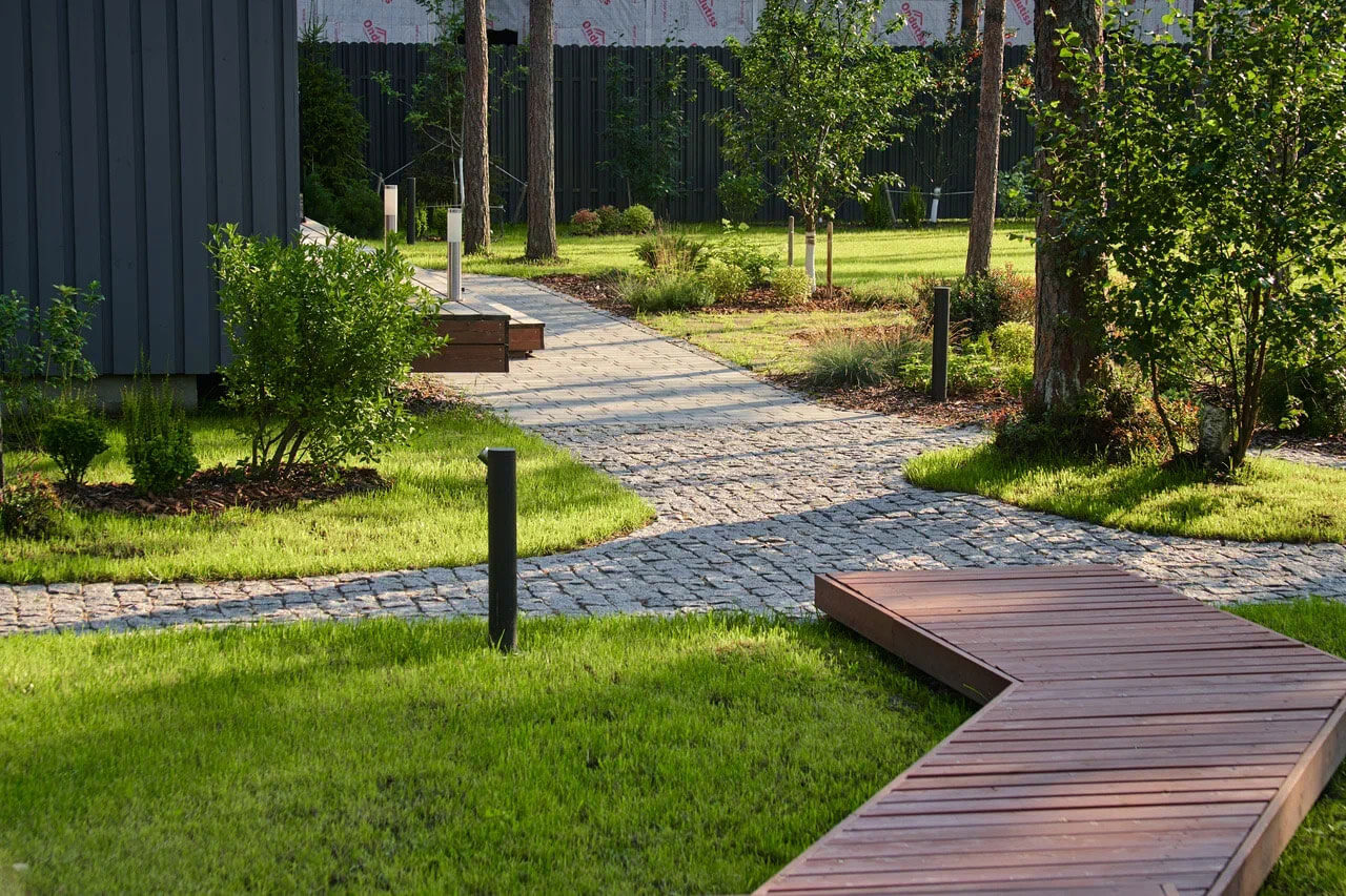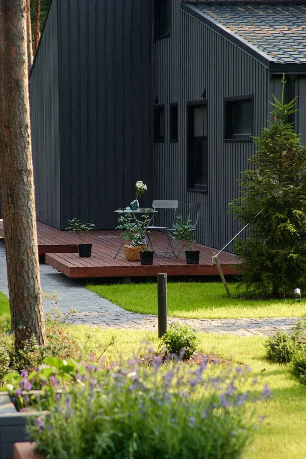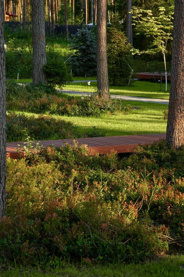 Участок с лесной зоной, лужайкой, грядками деревянным настилом и природными второстепенными дорожками — это место, где мы и заказчики нашли уединение и вдохновение.