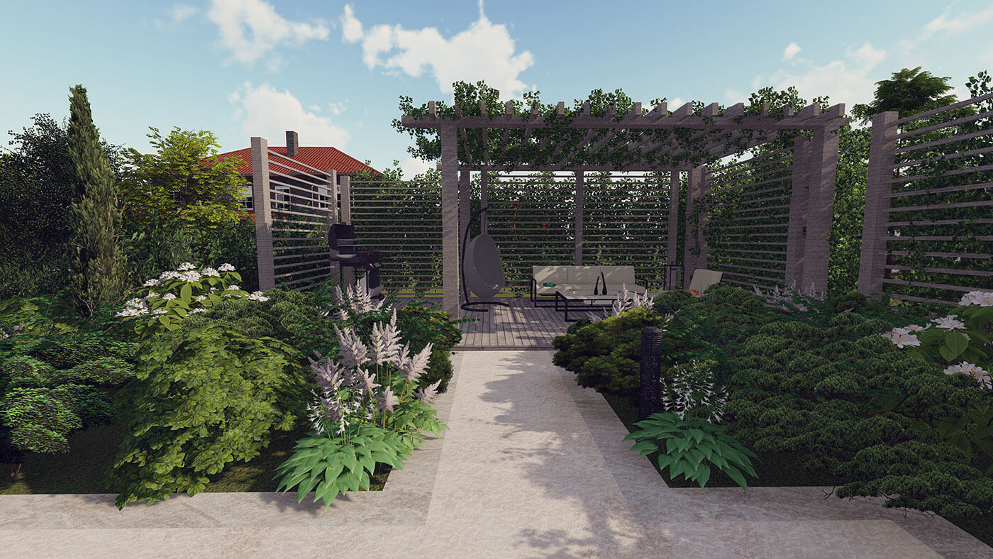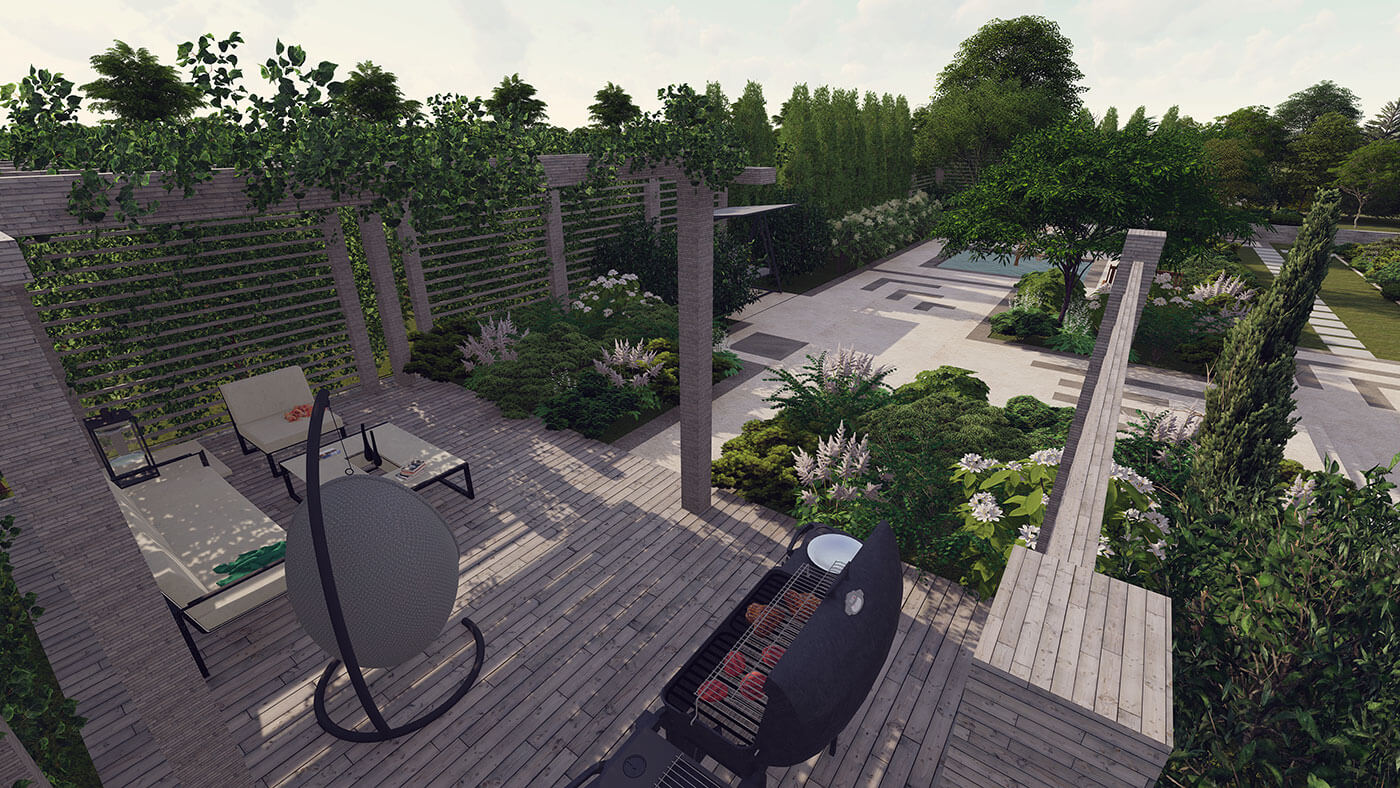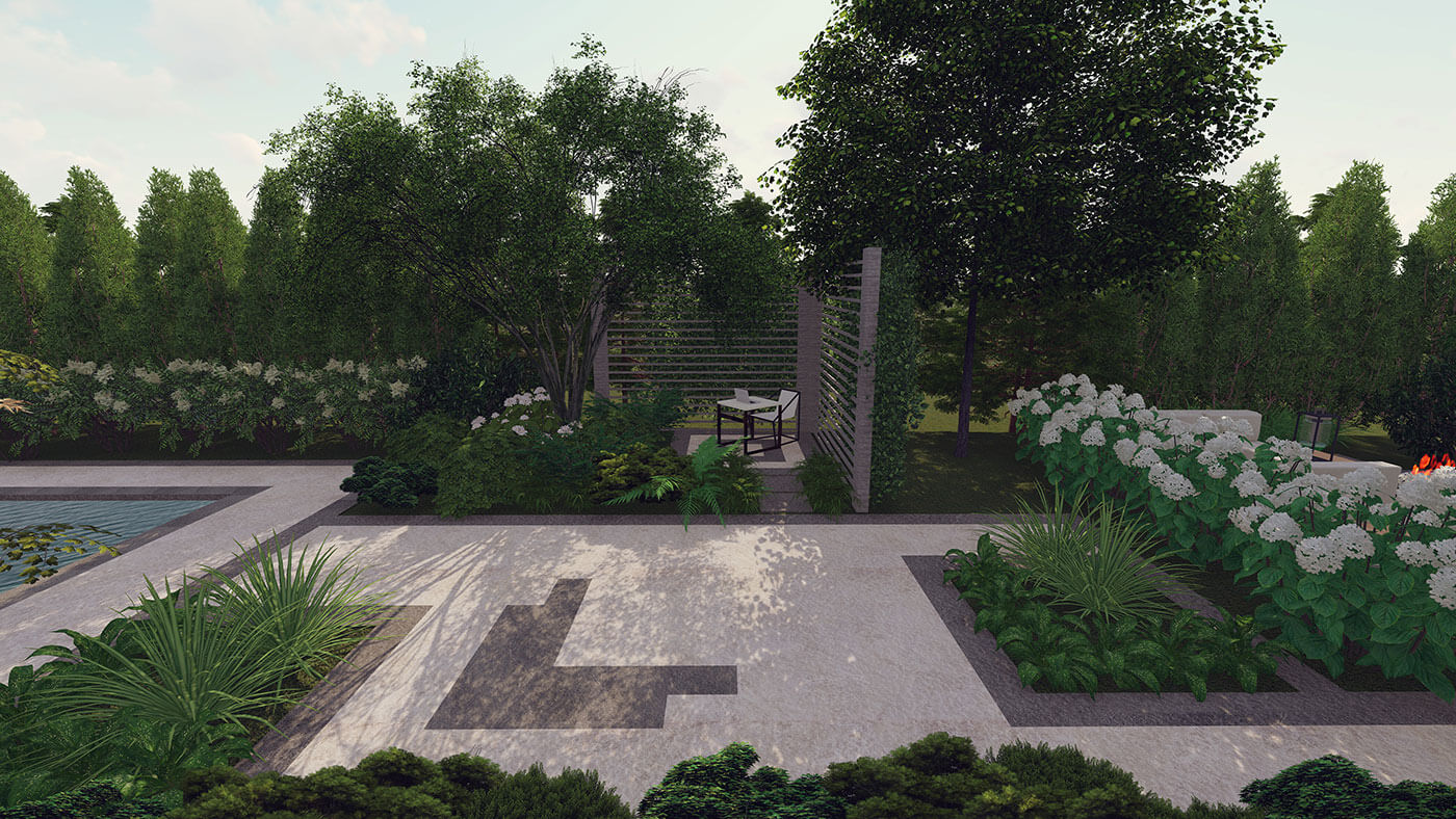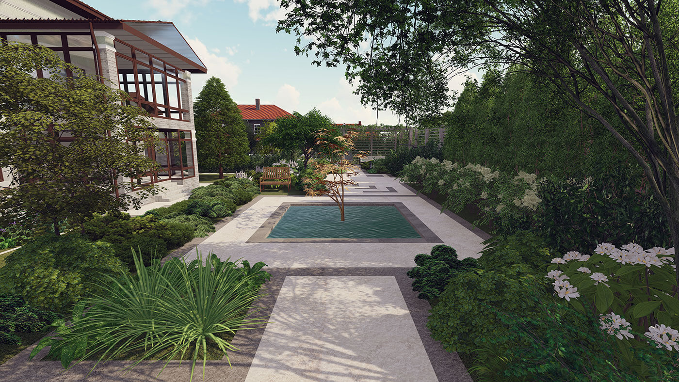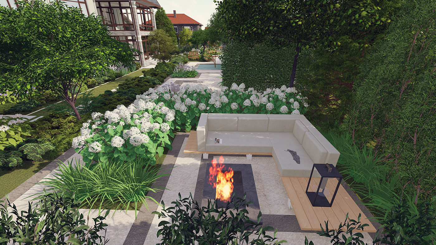 В структуре сада доминируют четкие, прямые линии. Мягкость и пышность, объем саду придают миксбордеры, которые окружают каждую зону отдыха и обрамляют места для передвижения. Мощение выполнено из светлого и темного керамогранита, фонтан — из бронзы, в виде дриады.