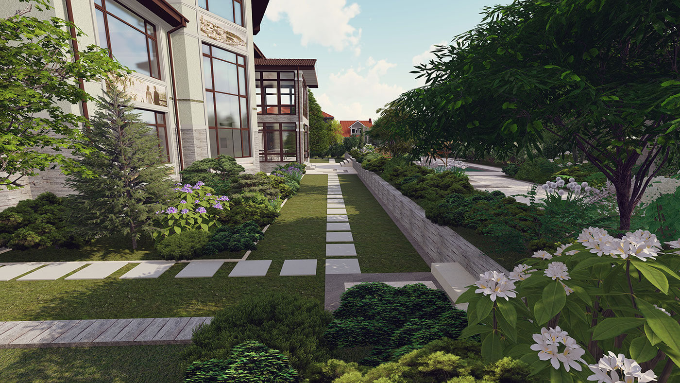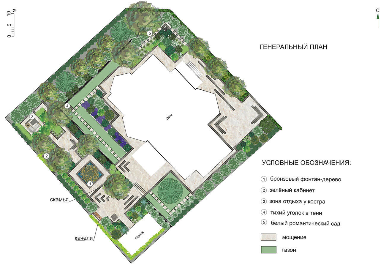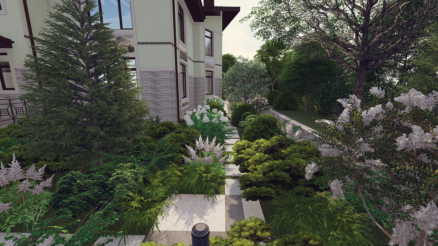 Любимый цвет заказчика — зеленый, именно поэтому было принято решение создать монохромный сад, используя разные оттенки зеленого в цветовой гамме растений, материалов, скульптуры.
